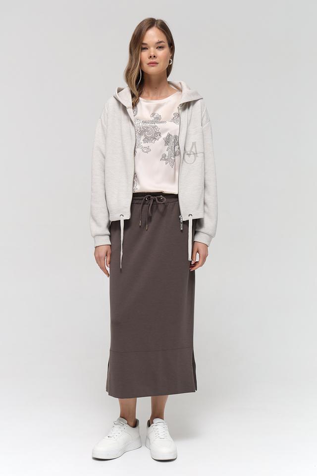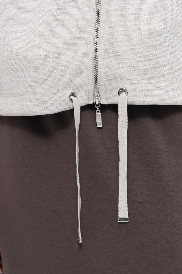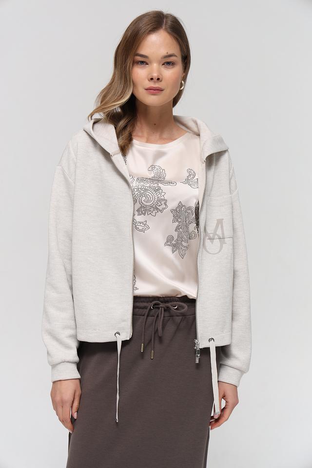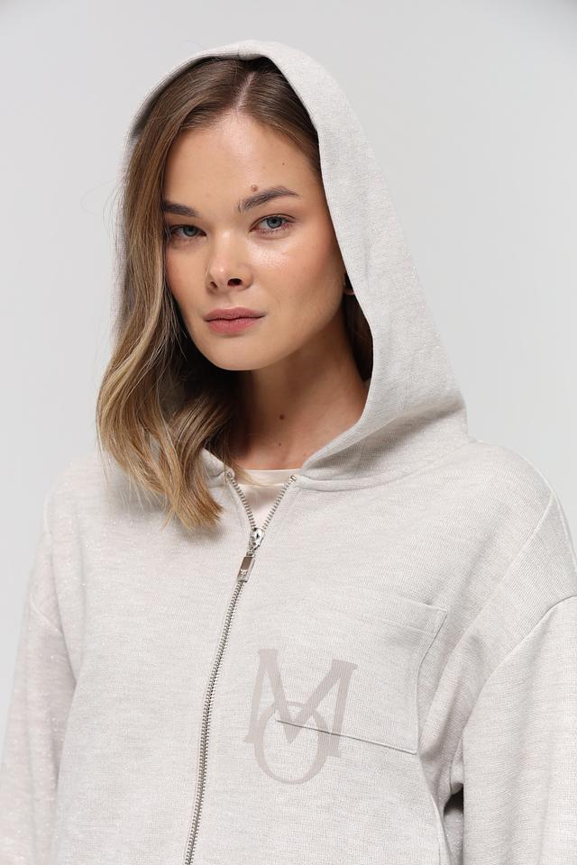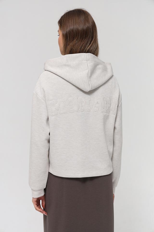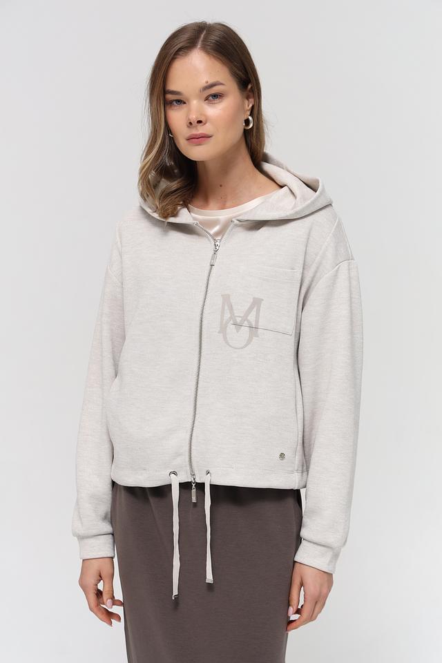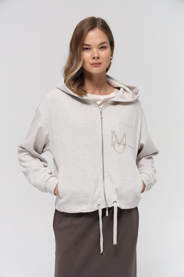 Серый жакет Monari – это стильная и удобная модель на молнии с капюшоном. Жакет выполнен из мягкого трикотажа с логотипом бренда и дополнен шнурками на талии, что позволяет регулировать силуэт. Состав: полиэстер 62%, вискоза 33%, метализ.полиэстер 5%