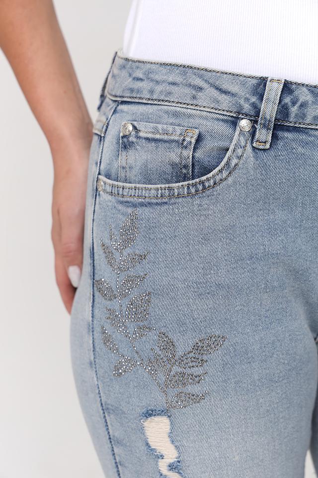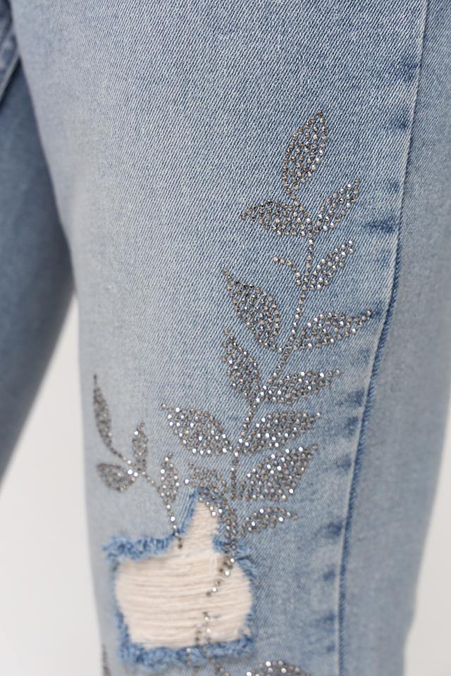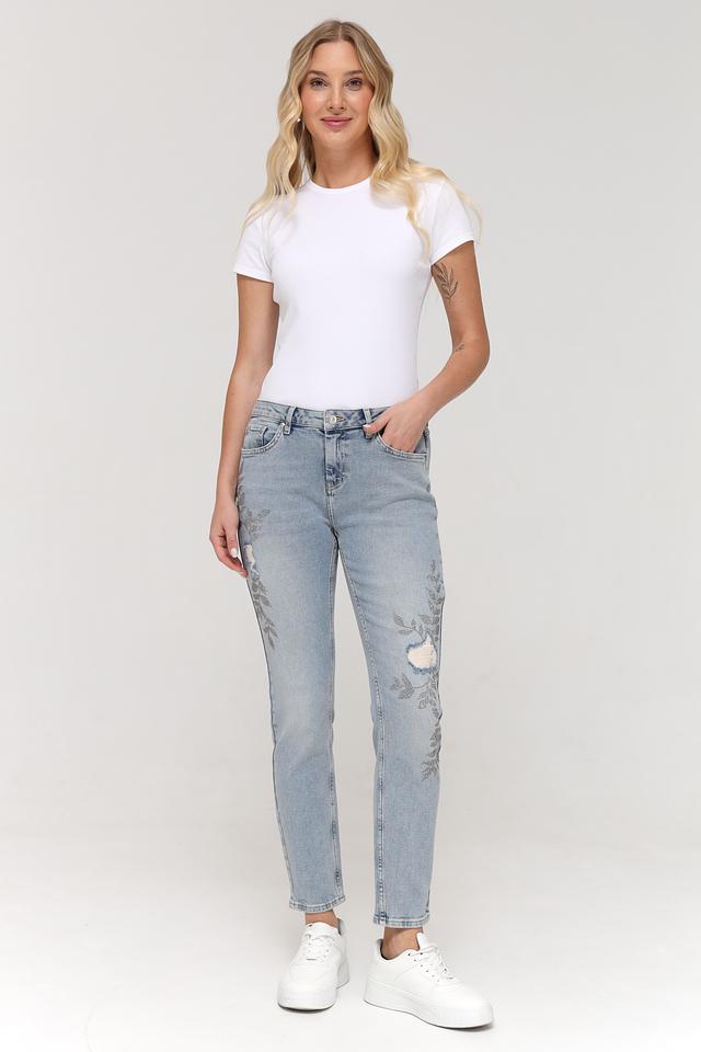 Голубые джинсы Monari с цветочной вышивкой и потертостями — стильное и комфортное решение для повседневного образа. Модель выполнена из качественного хлопка с добавлением эластана для лучшей посадки. Состав: хлопок 98%, эластан 2%