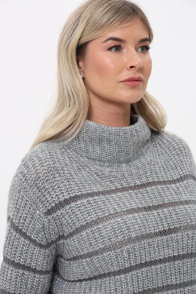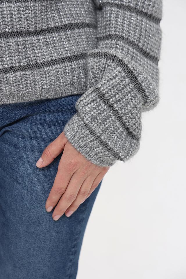Этот пуловер от Monari станет отличным дополнением к вашему гардеробу. Он выполнен в сером цвете с классическим полосатым узором, который всегда актуален.