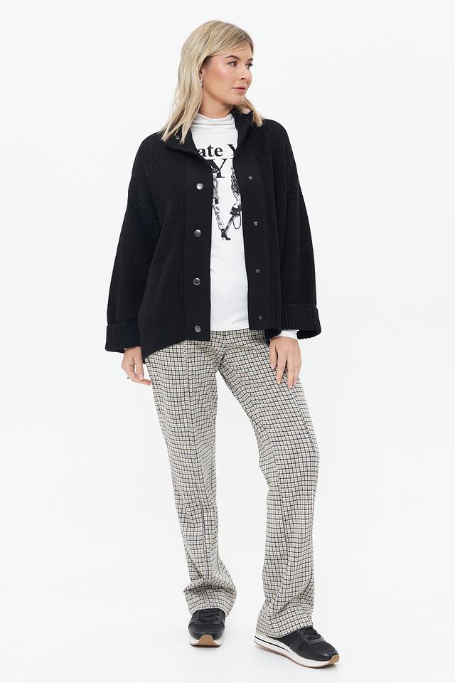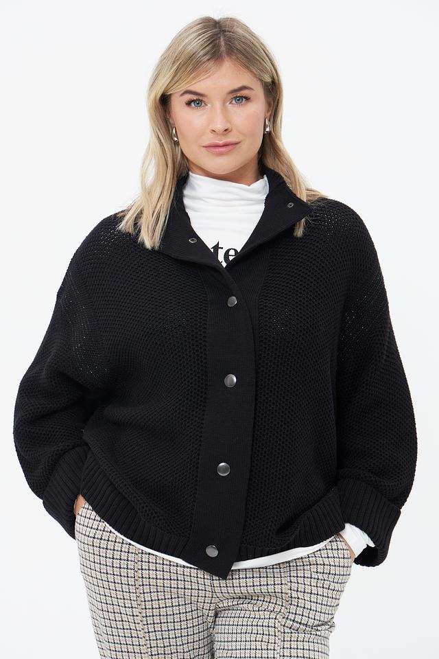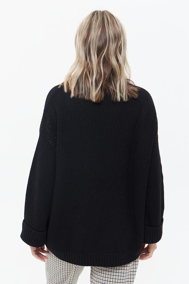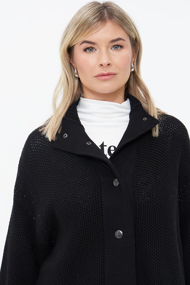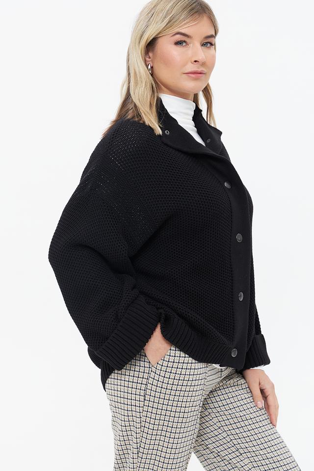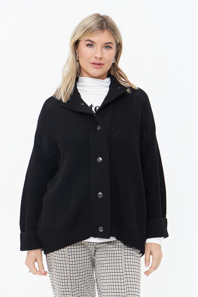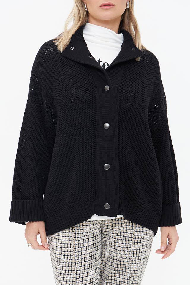Чёрный вязаный жакет Monari свободного кроя с застёжкой на пуговицы. Модель выполнена из 100% хлопка, имеет объёмные рукава и фактурную вязку. Состав: хлопок 100%