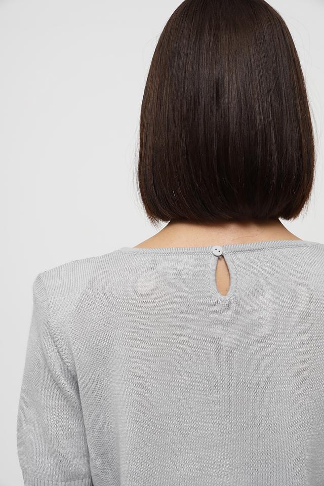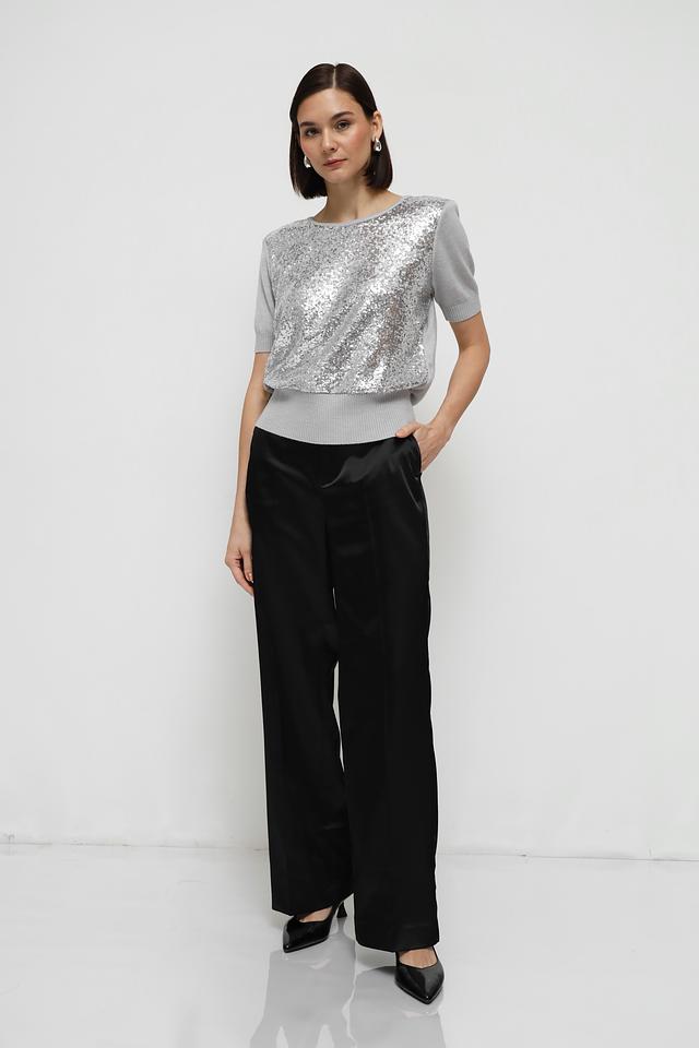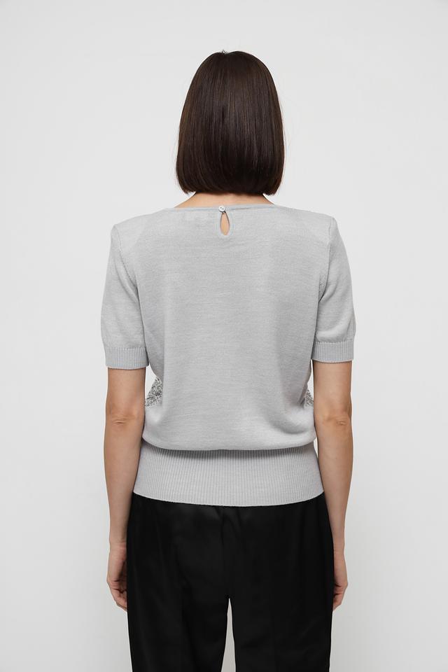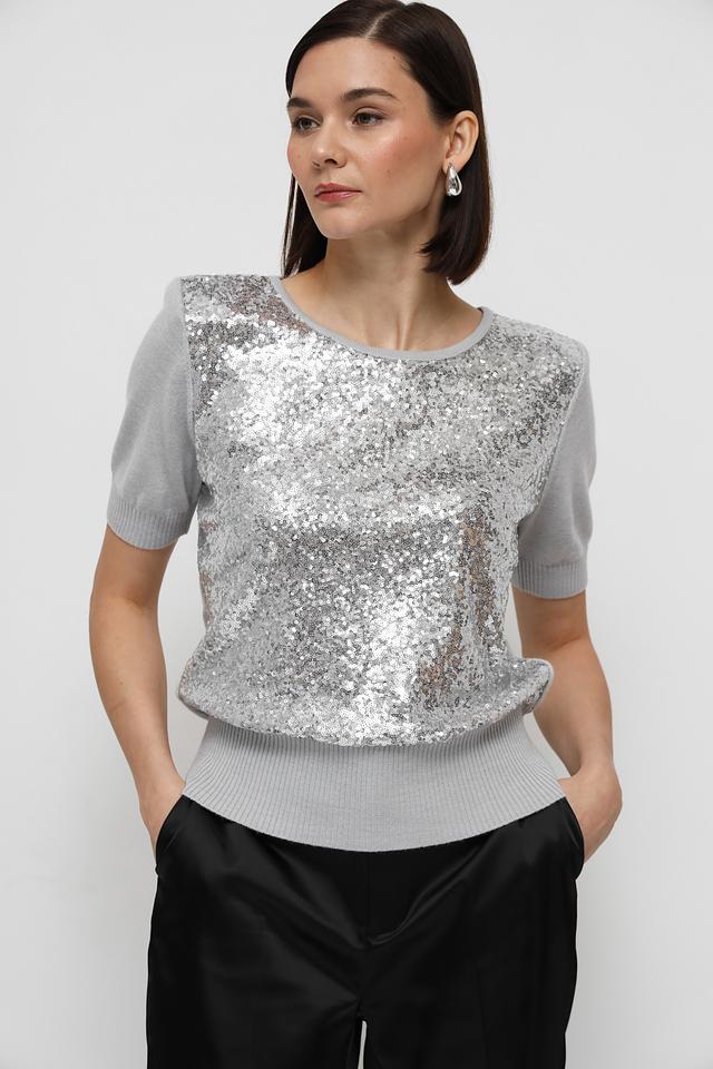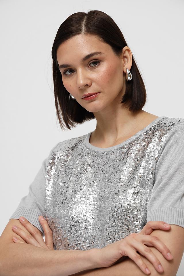 Пуловер имеет серый цвет и украшен эффектными пайетками на передней части. Круглый вырез горловины и короткие рукава делают его идеальным для теплой погоды или для создания многослойных образов.