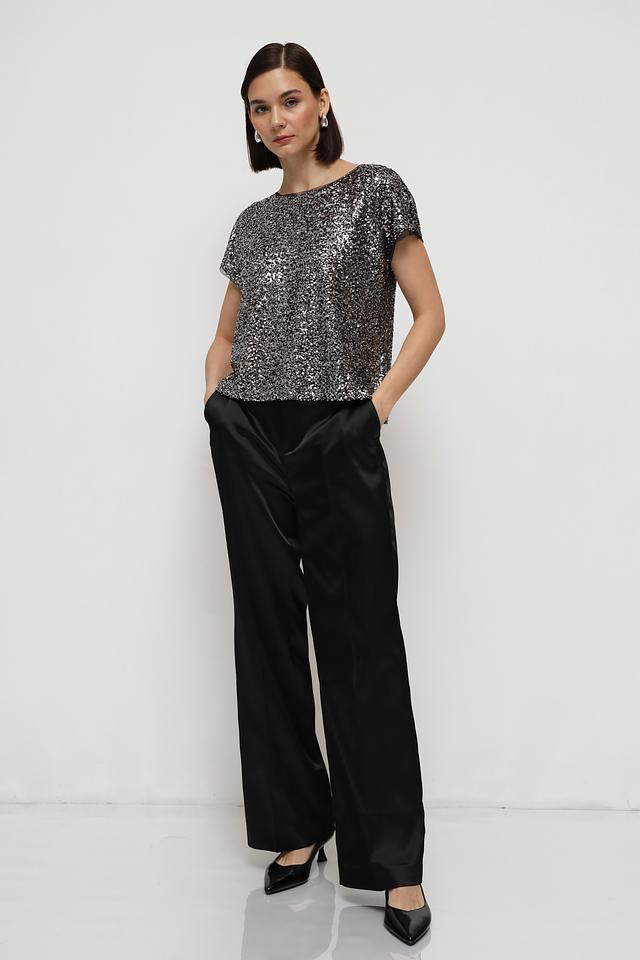 Эта эффектная блузка от Monari станет ярким акцентом вашего образа. Блузка полностью покрыта серебристыми пайетками, которые переливаются и создают неповторимый блеск.
