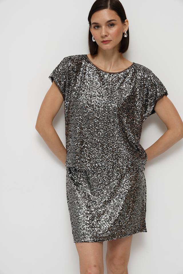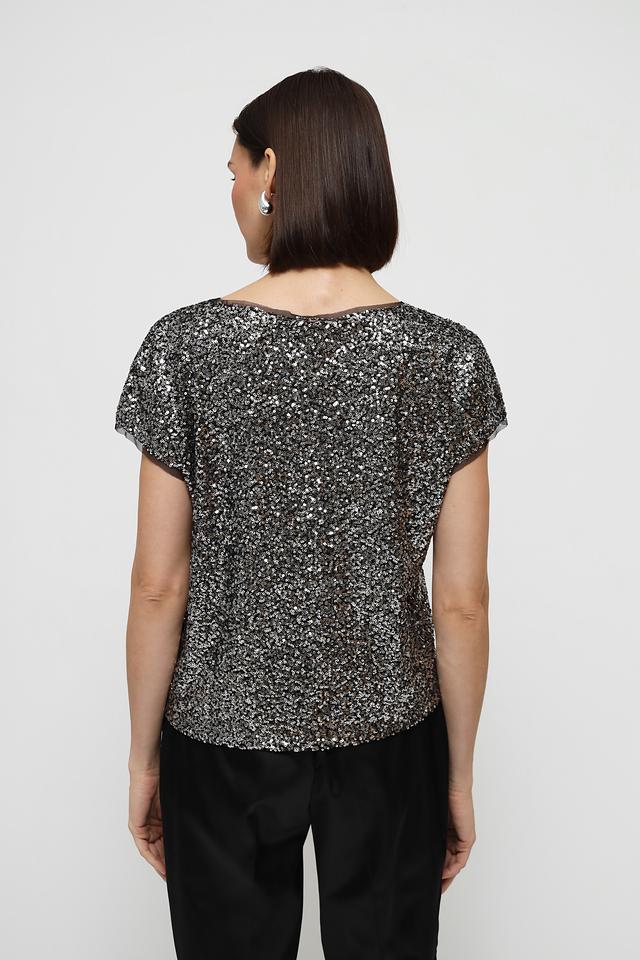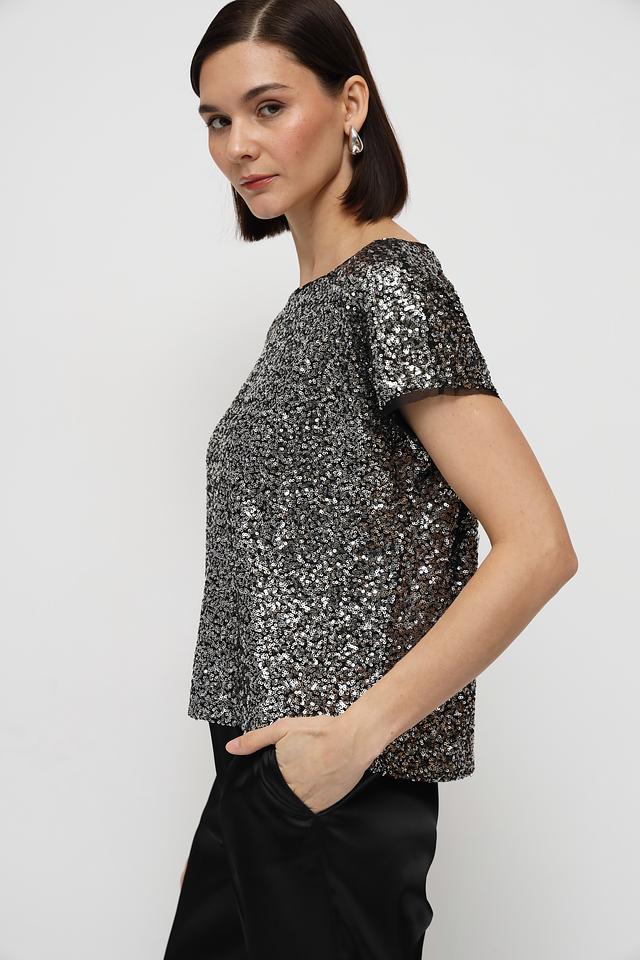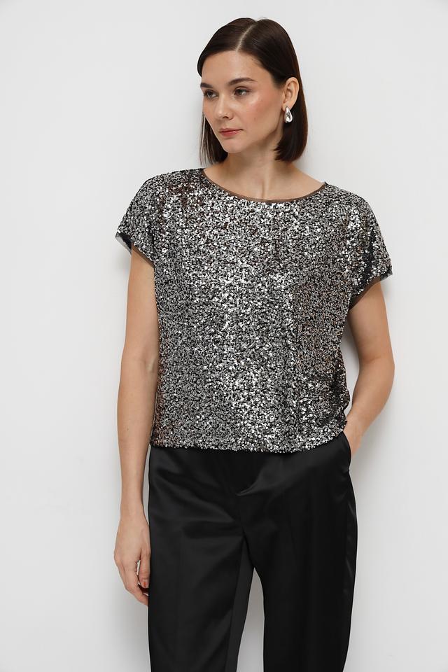 Блузка Monari серебристого цвета, полностью расшита пайетками, создавая эффектный и праздничный образ. Модель с короткими рукавами и округлым вырезом горловины станет отличным дополнением к вечернему гардеробу. Состав: полиэстер 100%