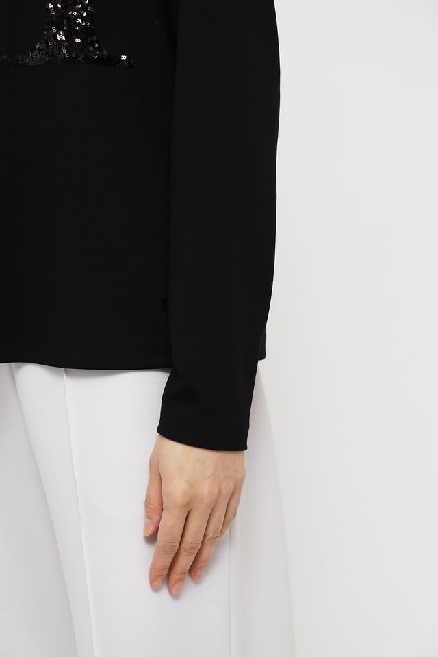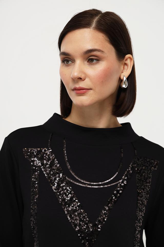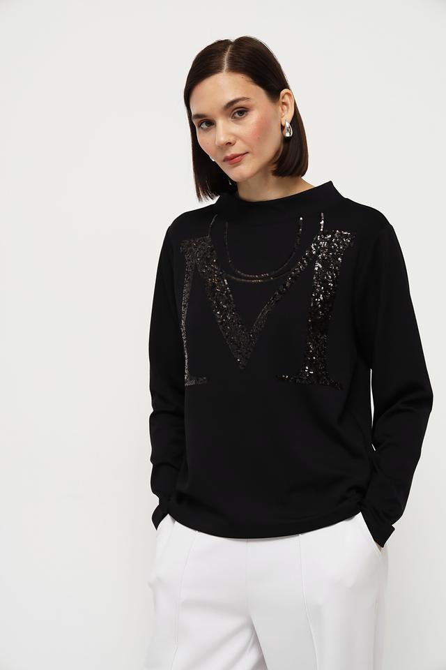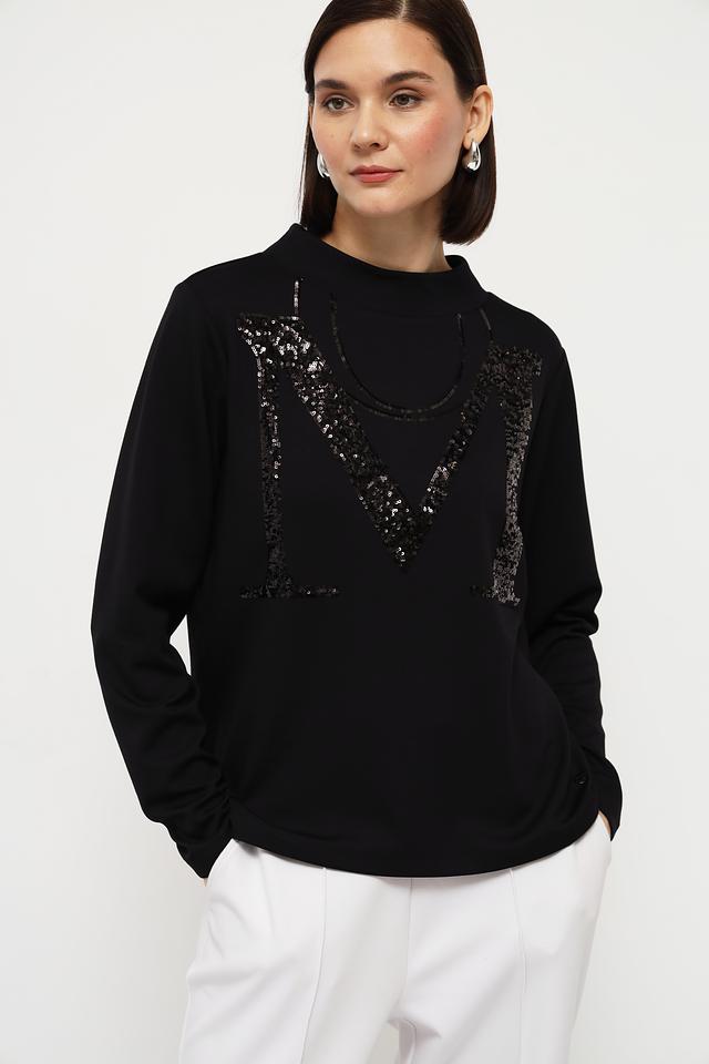 Чёрный пуловер Monari с эффектным декором в виде логотипа из пайеток станет стильным дополнением к вашему гардеробу. Модель выполнена из мягкого и приятного к телу трикотажа, обеспечивающего комфорт в носке. Состав: вискоза 48%, полиэстер 47%, эластан 5%