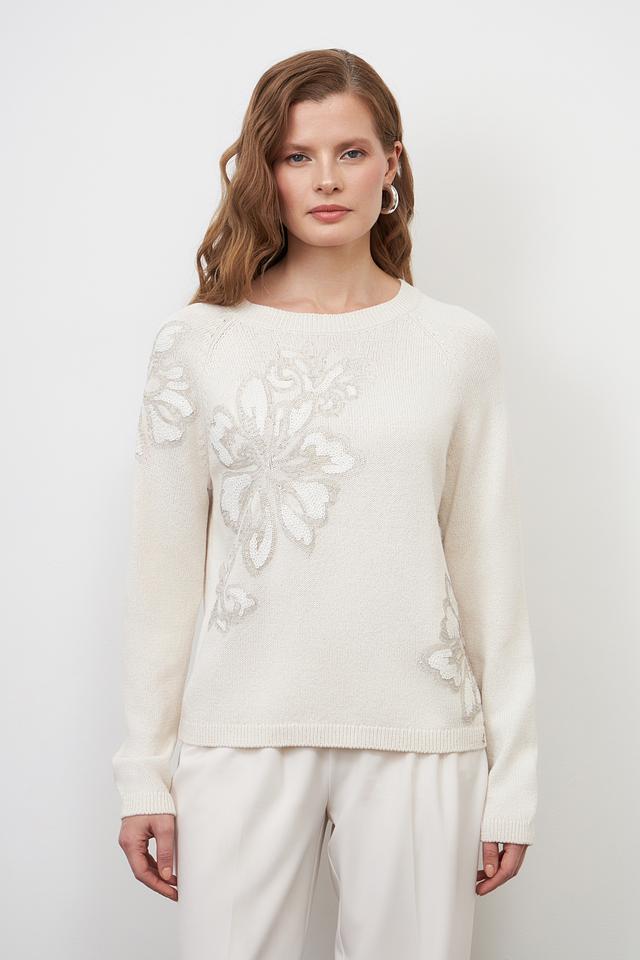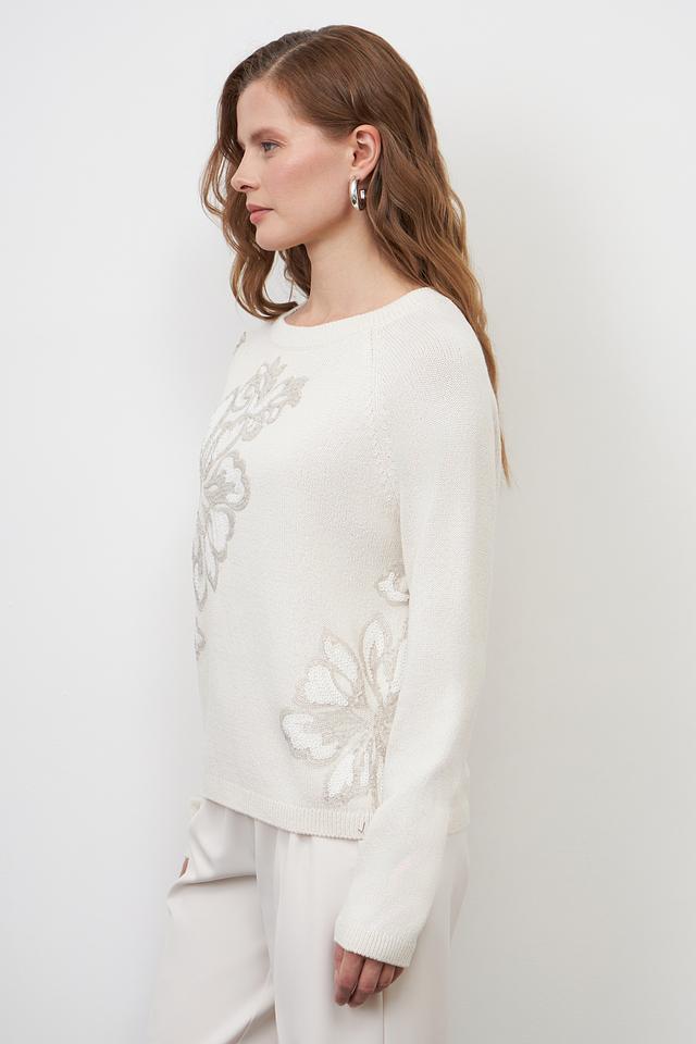 Этот пуловер от Monari выполнен в нежном бежевом цвете и украшен изысканным цветочным принтом. Модель имеет круглый вырез горловины и длинные рукава, что делает его универсальным для различных погодных условий.
