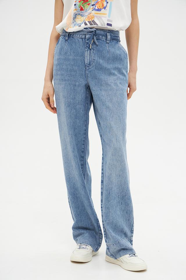 Женские джинсы Monari голубого цвета, выполнены в широком крое и с высокой посадкой. Модель отличается оригинальным дизайном с защипами и поясом на завязках, что обеспечивает комфортную посадку и стильный вид. Состав: лиоцел 100%