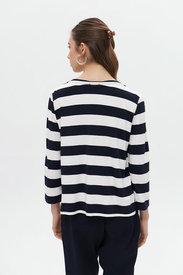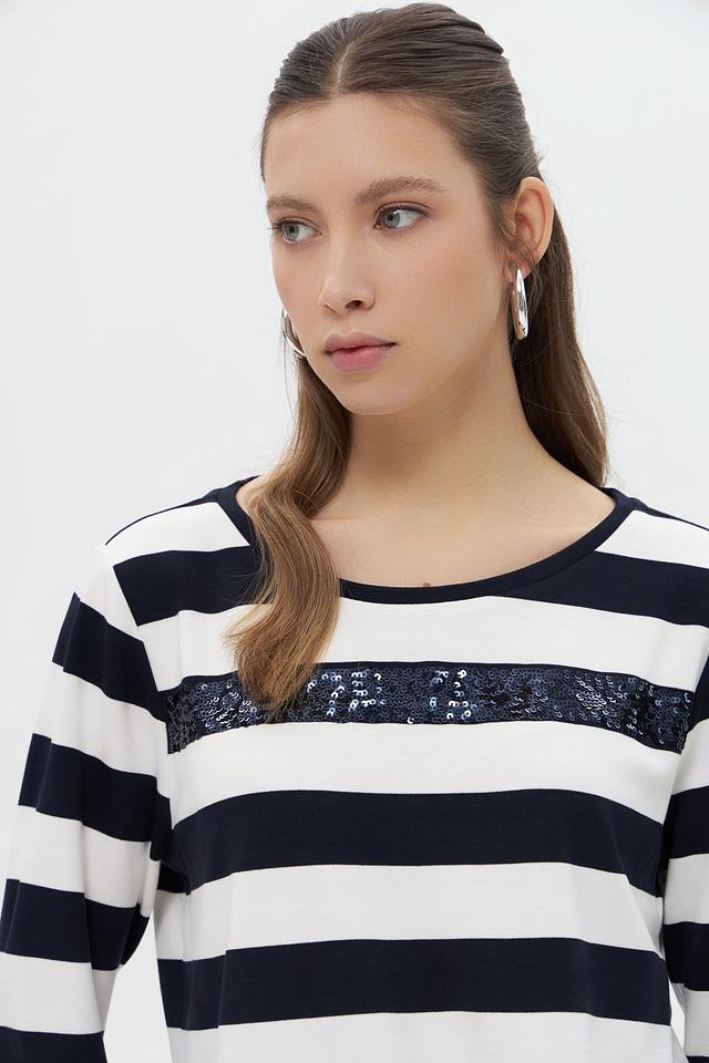 Женский лонгслив Monari сине-белого цвета с полосатым принтом и отделкой из пайеток. Модель с длинными рукавами и круглым вырезом горловины станет стильным дополнением к вашему гардеробу. Состав: вискоза 80%, полиэстер 15%, эластан 5%