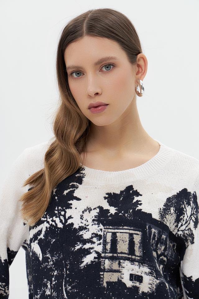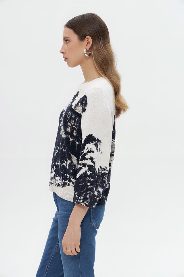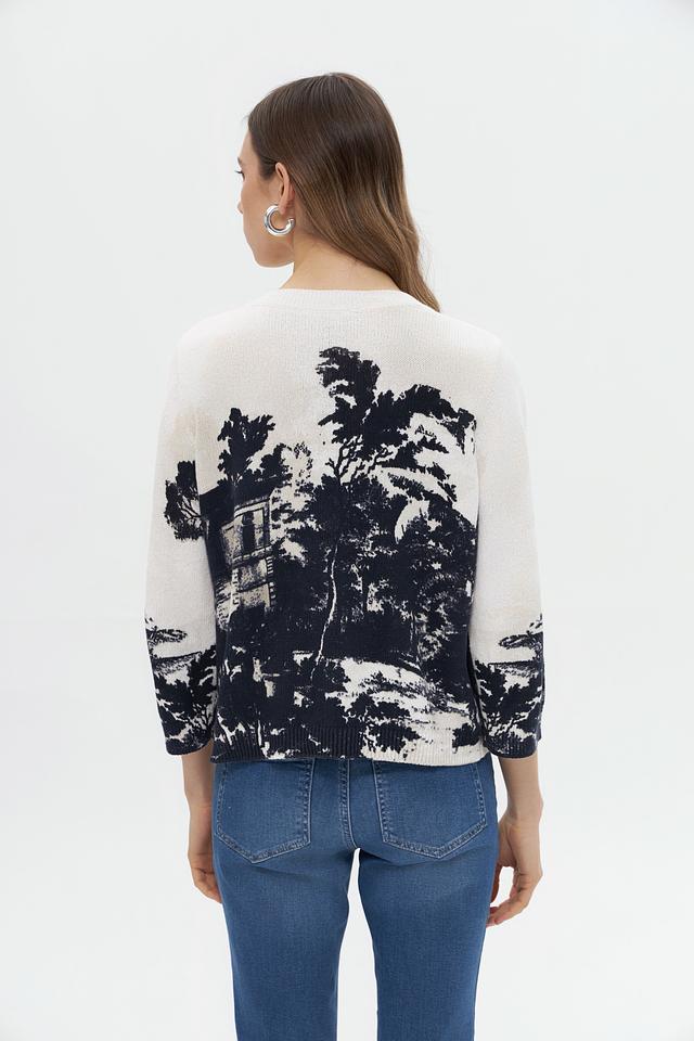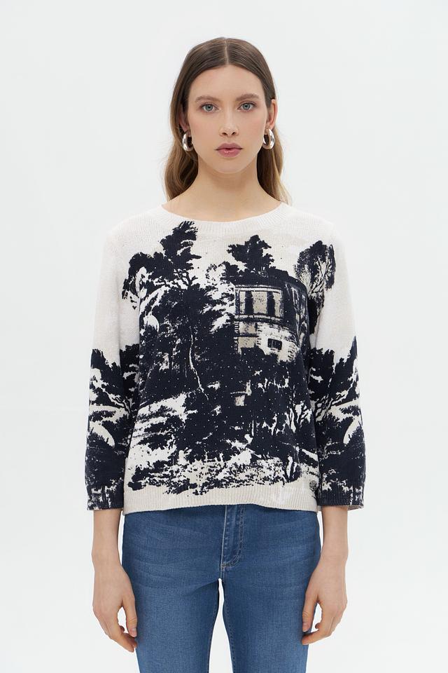Этот стильный пуловер от Monari выполнен в нежном бежевом цвете и украшен эффектным принтом, изображающим пейзаж с архитектурными элементами и растительностью.