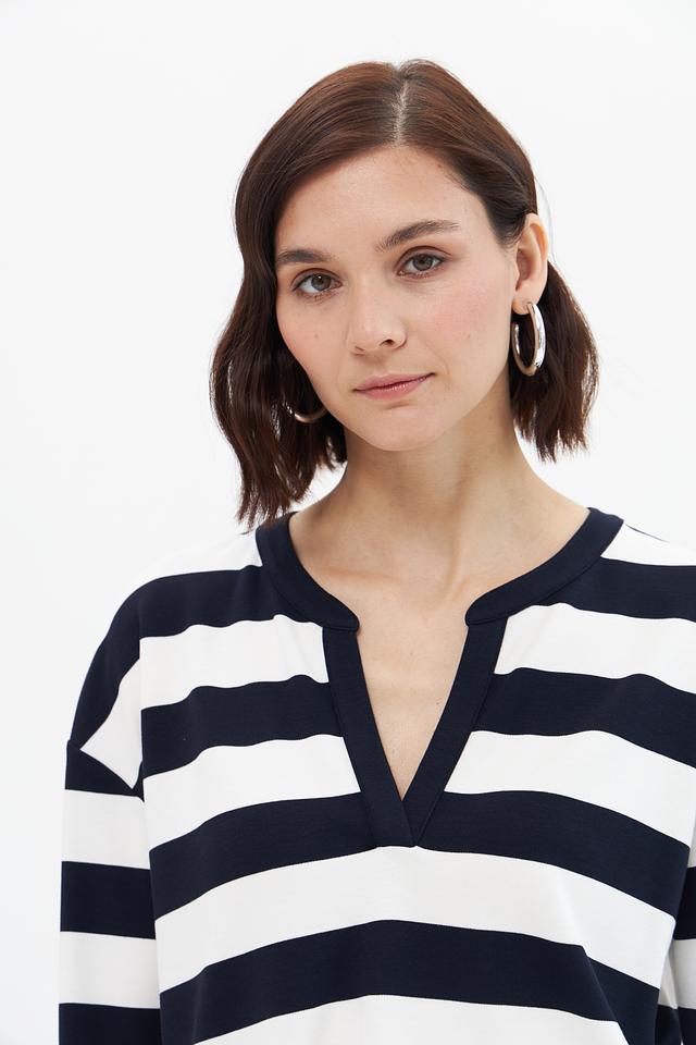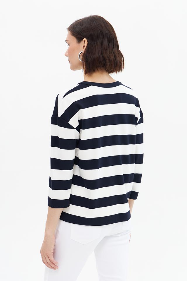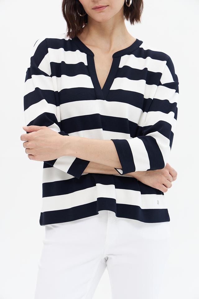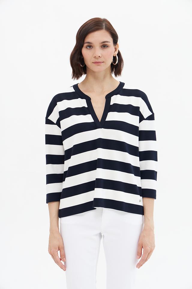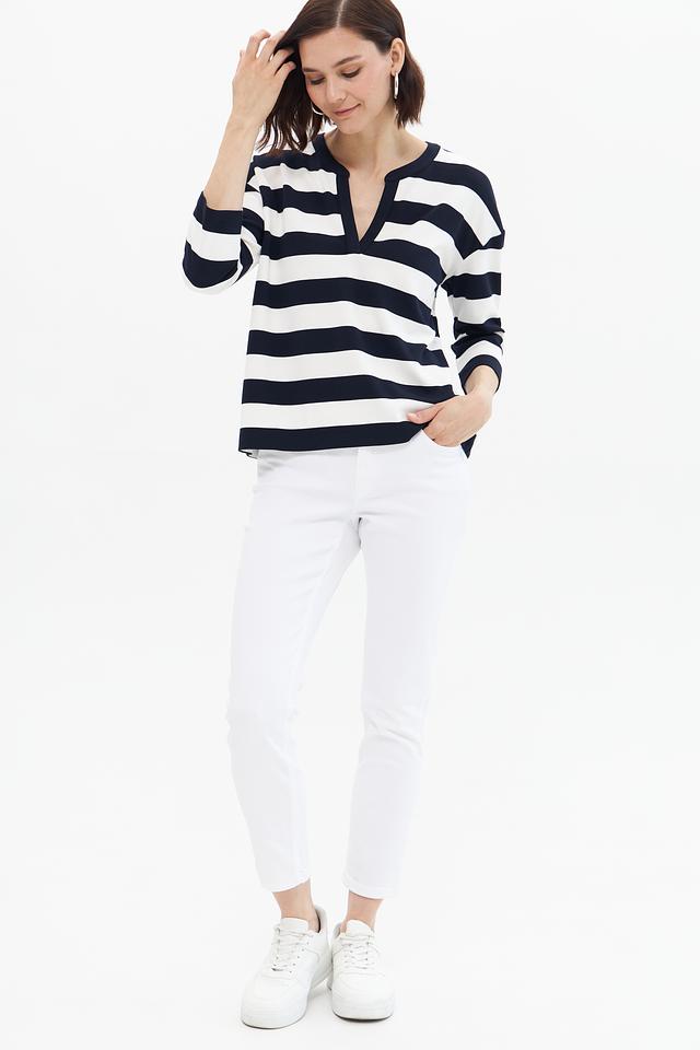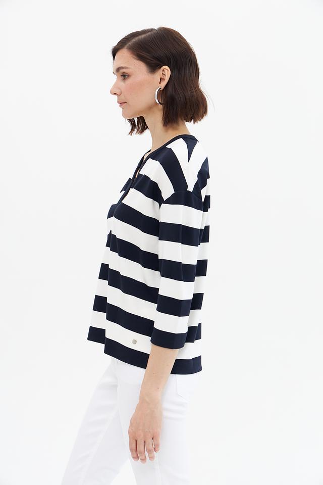 Этот стильный лонгслив от Monari станет отличным дополнением к вашему гардеробу. Модель выполнена в классической полосатой расцветке – сочетание насыщенного синего и белого цветов выглядит свежо и актуально.