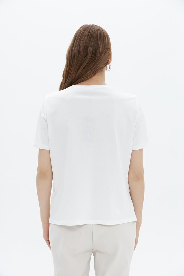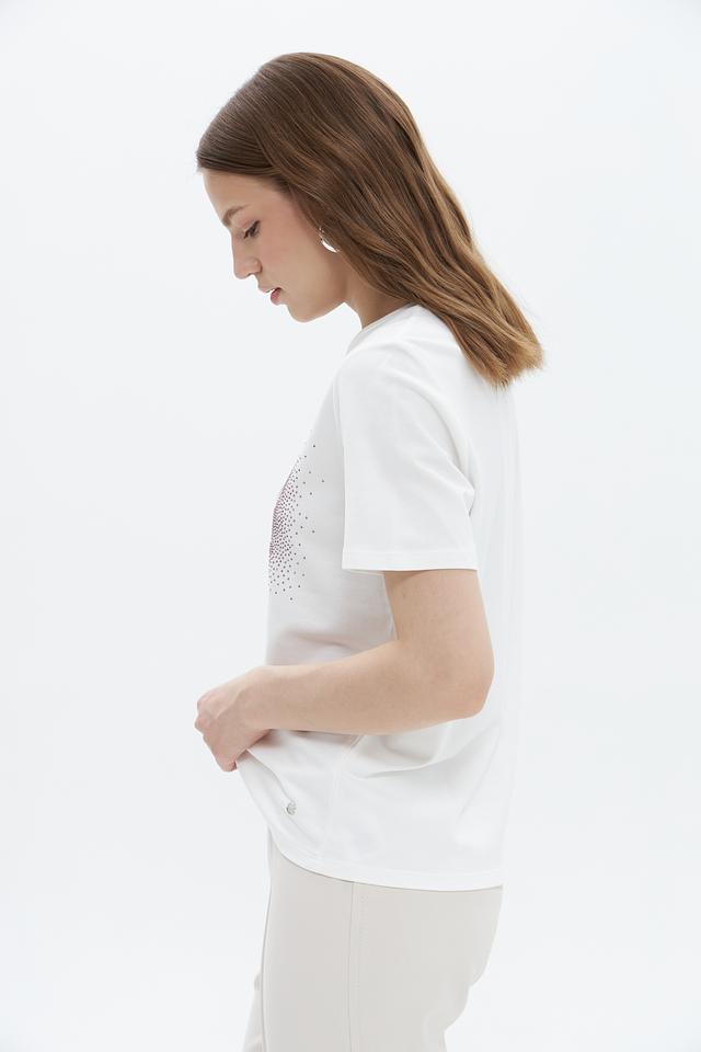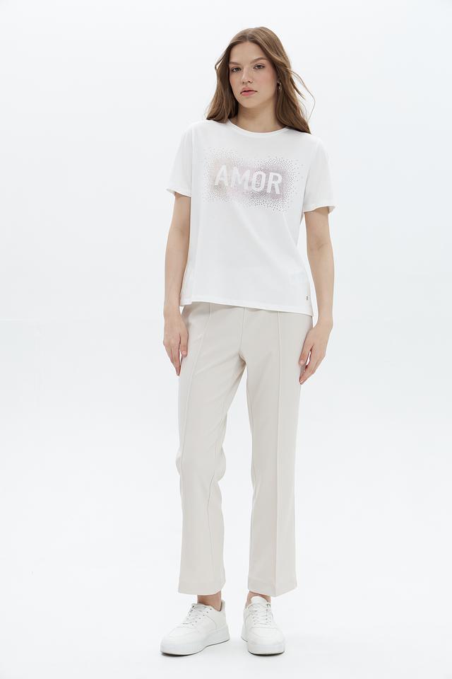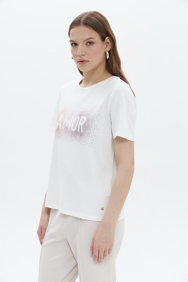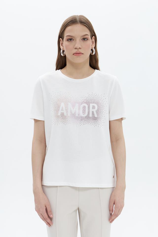 Белая футболка Monari с яркой надписью "AMOR", выполненная из мягкого хлопка с модалом. Стильный крой и декор из страз делают эту футболку отличным выбором для создания повседневного образа. Состав: хлопок 50%, модал 50%
