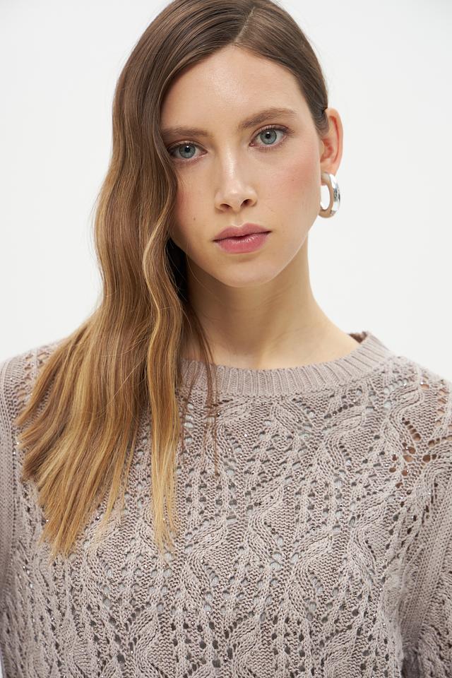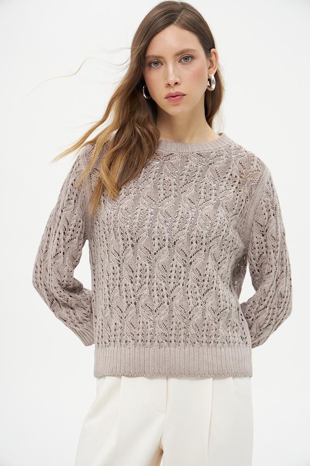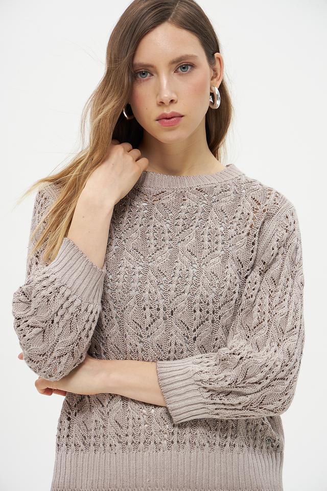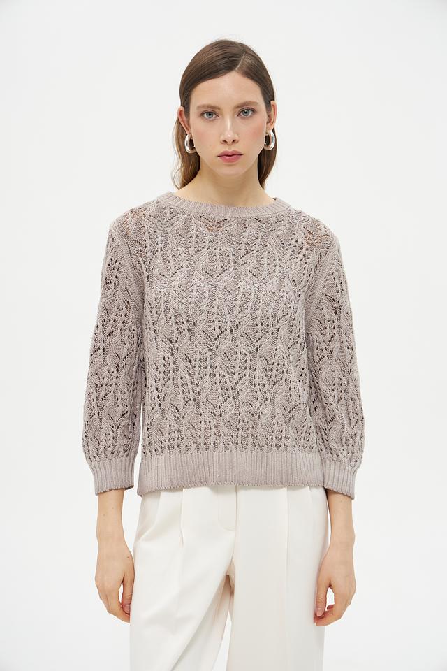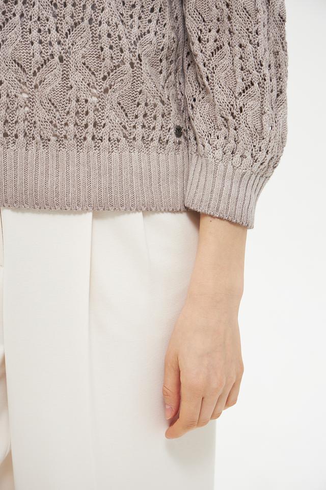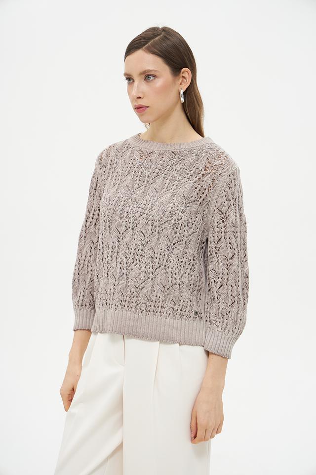 Светло-бежевый пуловер Monari из льна и хлопка с ажурным узором станет отличным дополнением к вашему гардеробу. Модель имеет округлый вырез горловины и рукава 3/4, что делает ее универсальной для создания различных образов. Состав: лен 63%, хлопок 37%