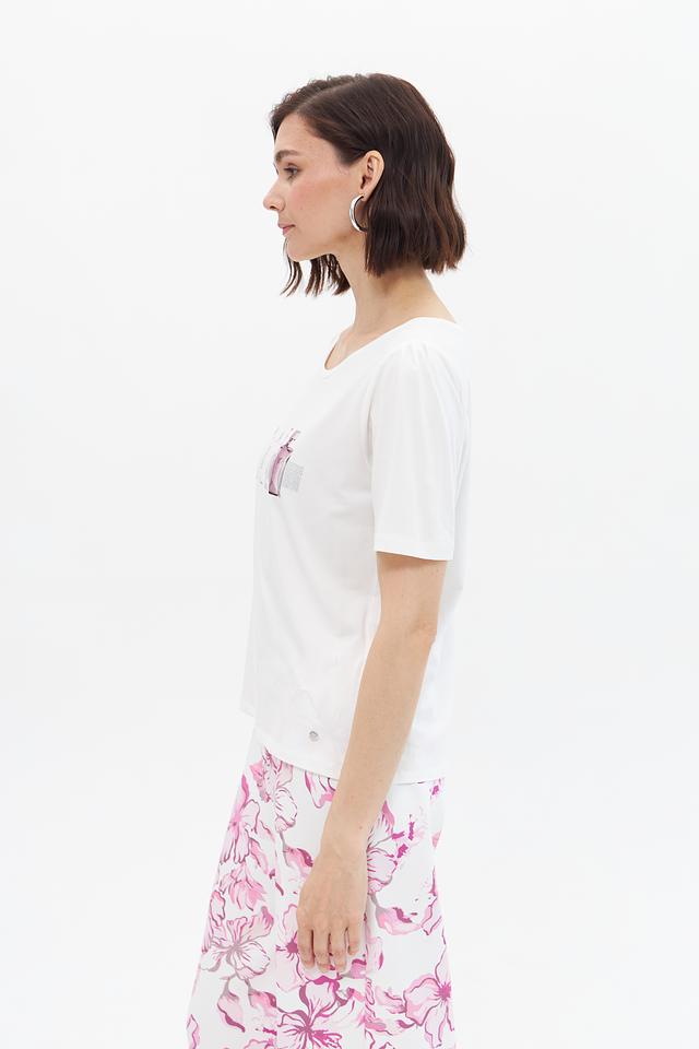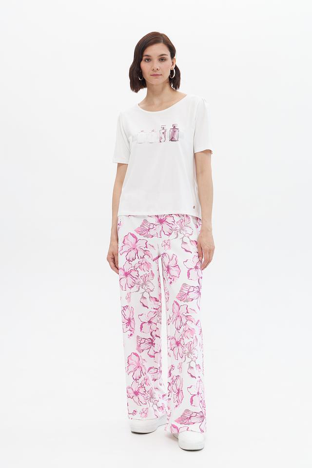 Белая футболка Monari с коротким рукавом и оригинальным принтом в виде флаконов духов. Изготовлена из мягкого и приятного к телу сочетания хлопка и модала, обеспечивающего комфорт в носке. Состав: хлопок 47%, модал 47%, эластан 6%