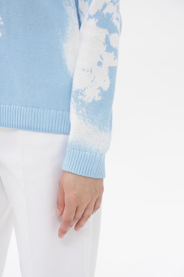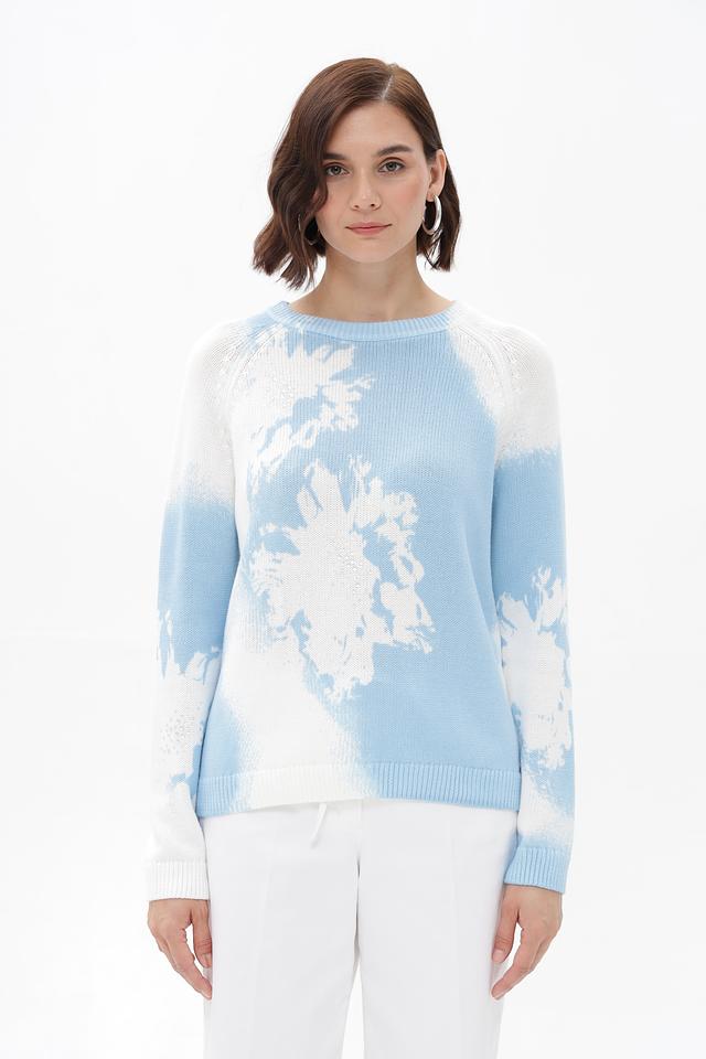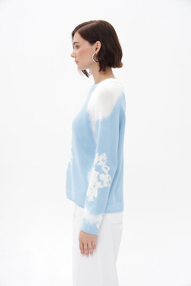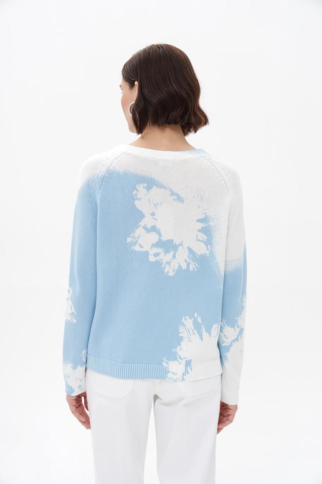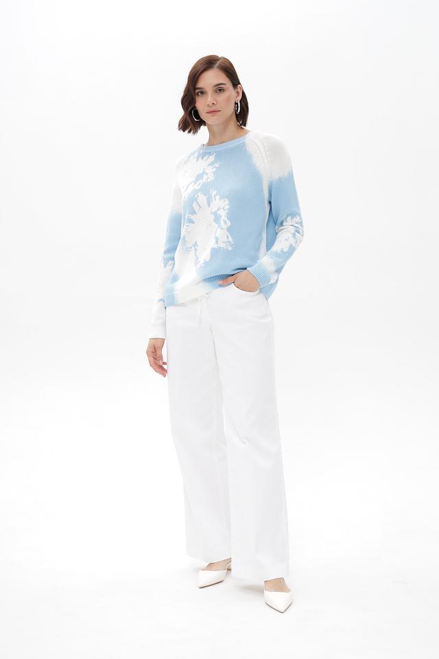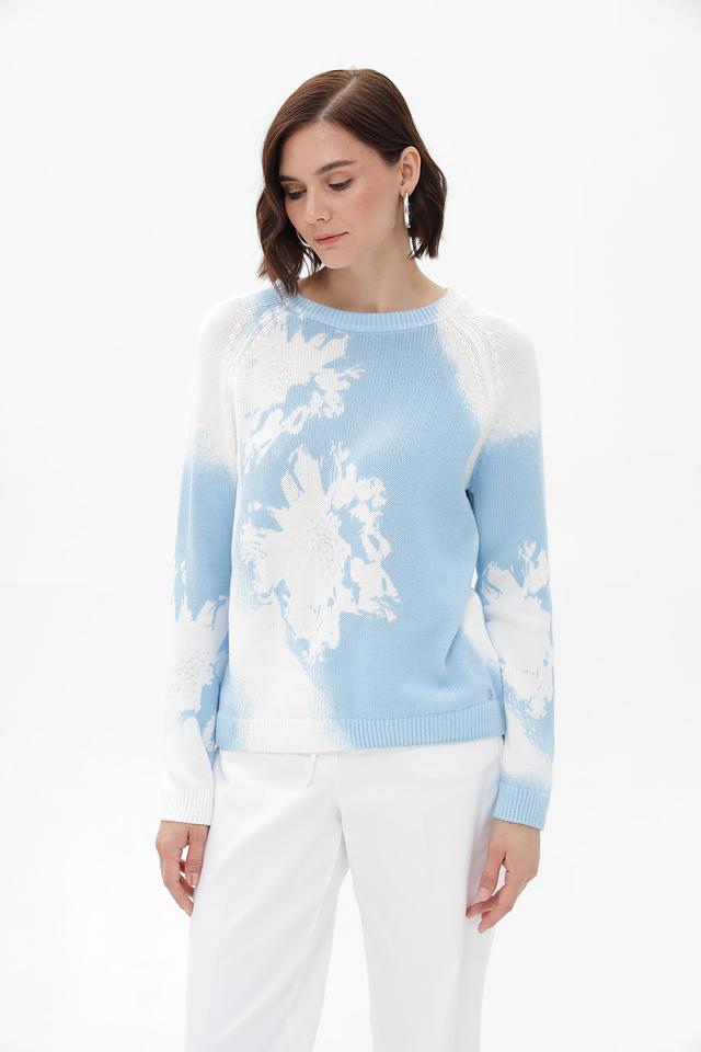 Модель имеет прямой крой и круглый вырез горловины. Пуловер украшен ярким цветочным принтом, выполненным в голубых и белых тонах, который придает образу свежесть и легкость.