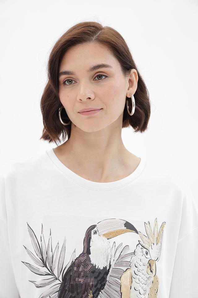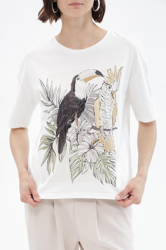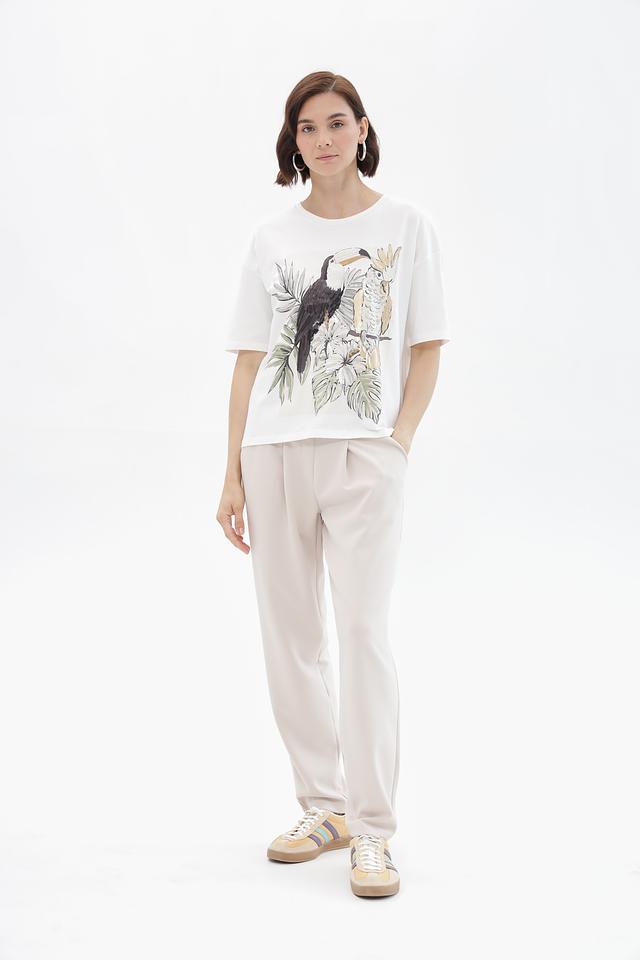 Основным акцентом футболки является яркий и детализированный принт с изображением тропических птиц – туканов – и пышной зелени. Этот принт добавляет образу свежести и оригинальности.