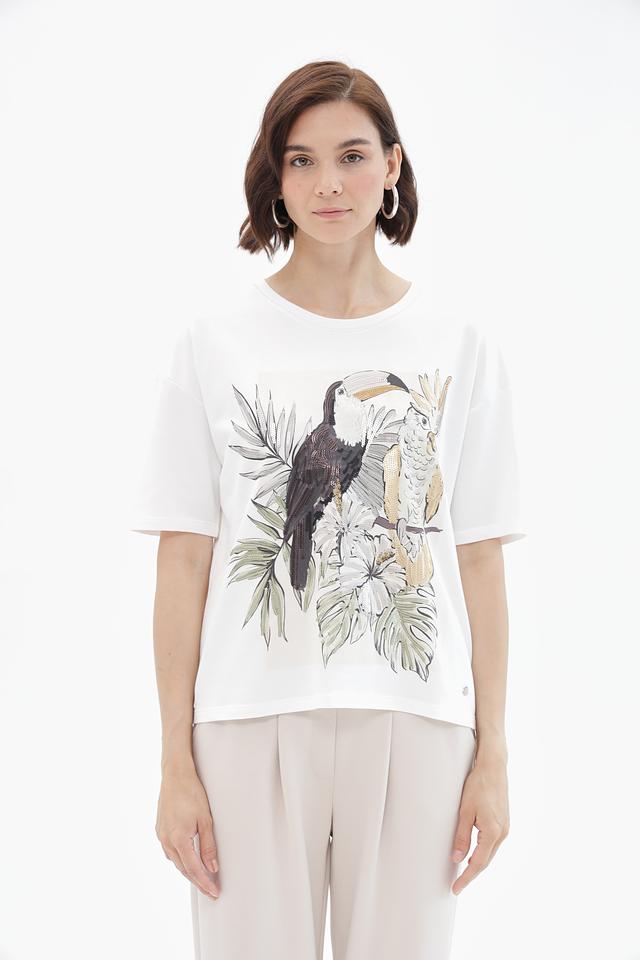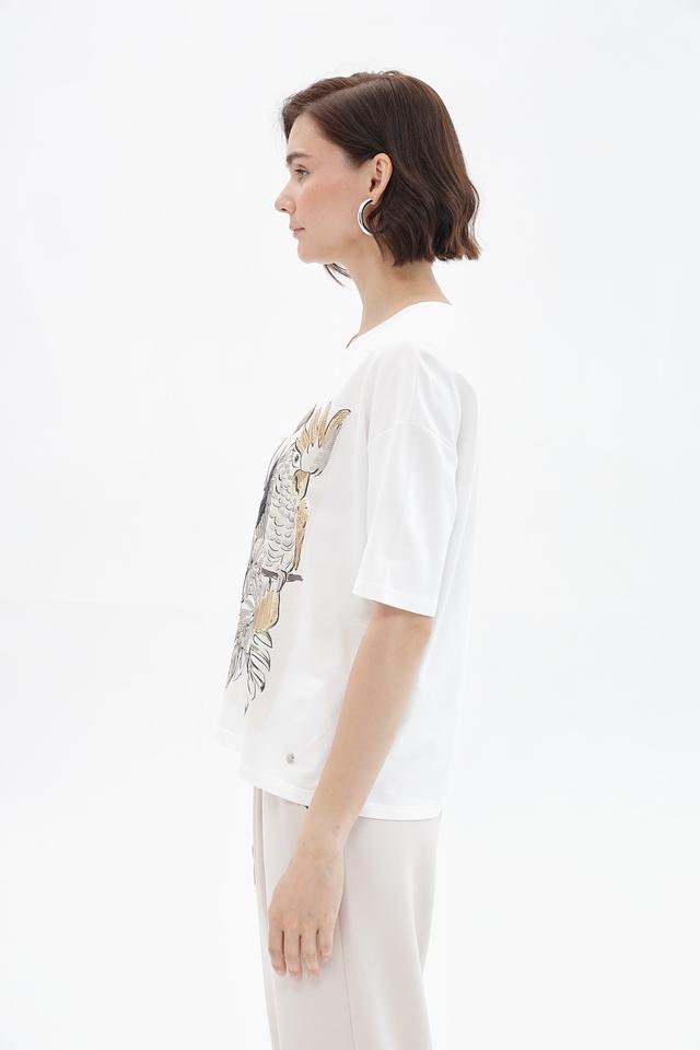 Белая футболка Monari с ярким принтом тропических птиц и листьев станет стильным дополнением к вашему гардеробу. Изготовлена из мягкого и приятного к телу сочетания хлопка и модала, обеспечивая комфорт в течение всего дня. Состав: хлопок 50%, модал 50%