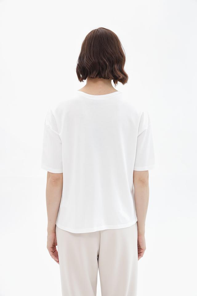 Фасон футболки – свободный, с короткими рукавами и округлым вырезом горловины. Такая модель отлично подойдет для повседневной носки и легко сочетается с различными элементами гардероба, такими как джинсы, шорты или юбки.