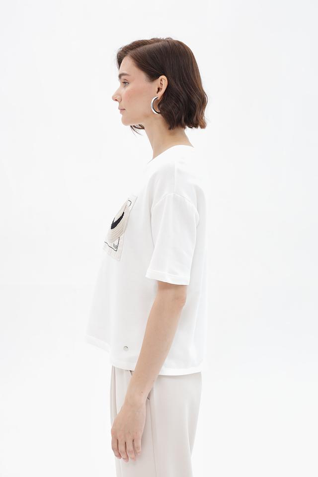 Белая футболка Monari с оригинальным принтом "Free Spirit" станет стильным дополнением к вашему гардеробу. Модель из 100% хлопка обеспечивает комфорт и удобство в носке. Состав: хлопок 100%