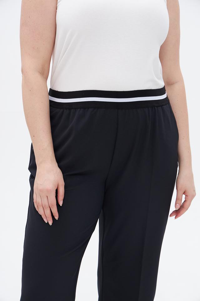 Модель выполнена из высококачественного полиэстера с добавлением эластана, что обеспечивает комфортную посадку и свободу движений. Эластичный пояс с контрастной полоской не только обеспечивает удобство, но и добавляет стильный акцент.