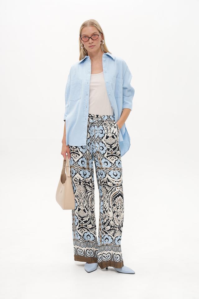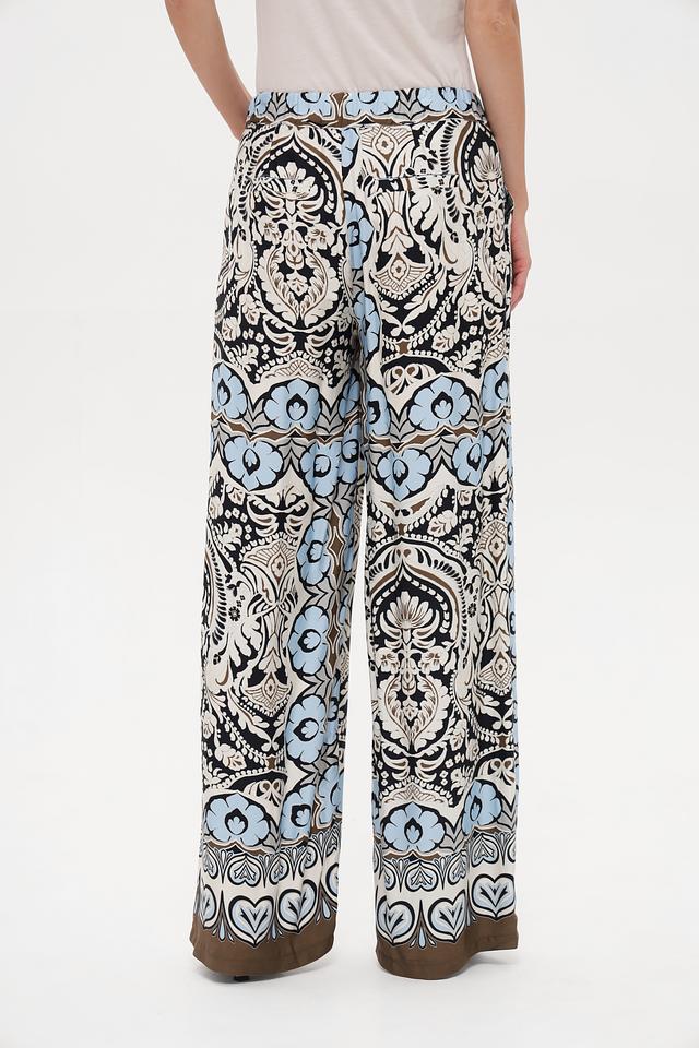 Особое внимание привлекает яркий цветочный принт, выполненный в сочетании голубого, белого, коричневого и чёрного цветов. Такой рисунок добавит вашему образу оригинальности и неповторимости. Брюки легко сочетаются с различными топами и обувью, позволяя создавать разнообразные стильные комплекты.