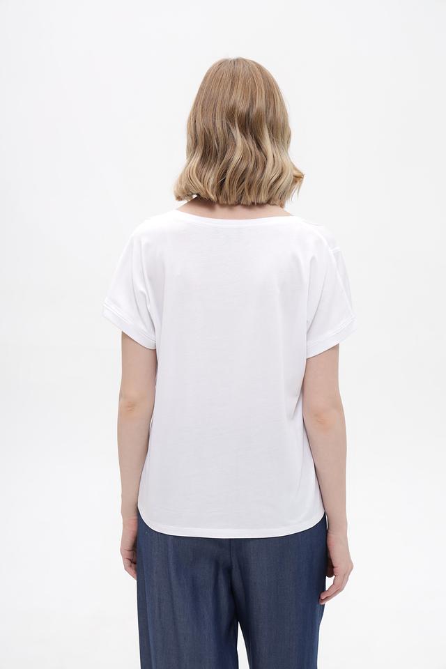 Белая футболка Monari из хлопка и модала с декоративным кружевным карманом. Удобный крой и натуральный состав обеспечивают комфорт в течение дня. Состав: хлопок 50%, модал 50%