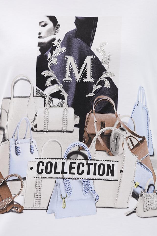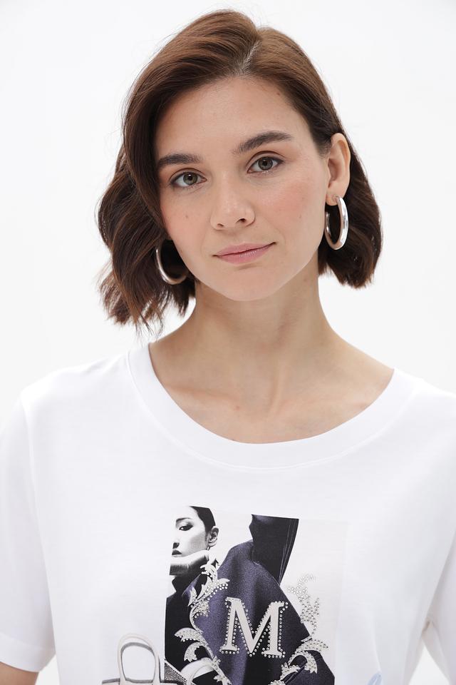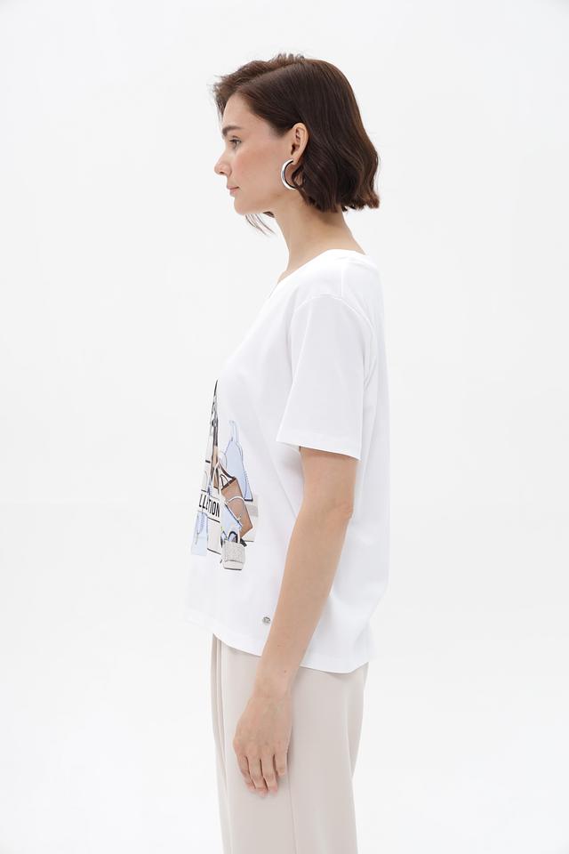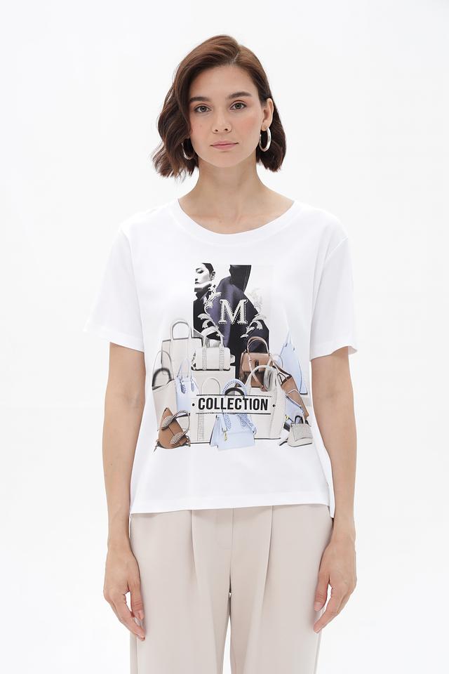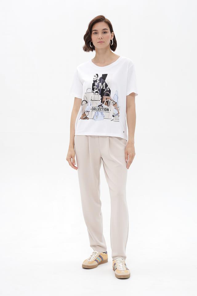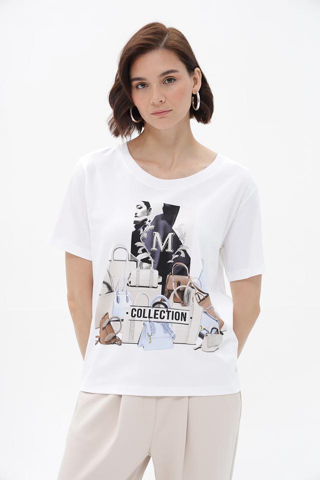 Белая футболка Monari с ярким принтом в виде стилизованных изображений сумок и женского силуэта. Изготовлена из 100% хлопка, обеспечивая комфорт и воздухопроницаемость. Идеальный выбор для создания модного и непринужденного образа. Состав: хлопок 100%