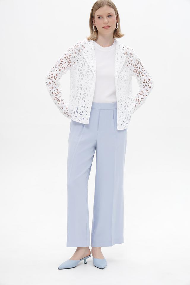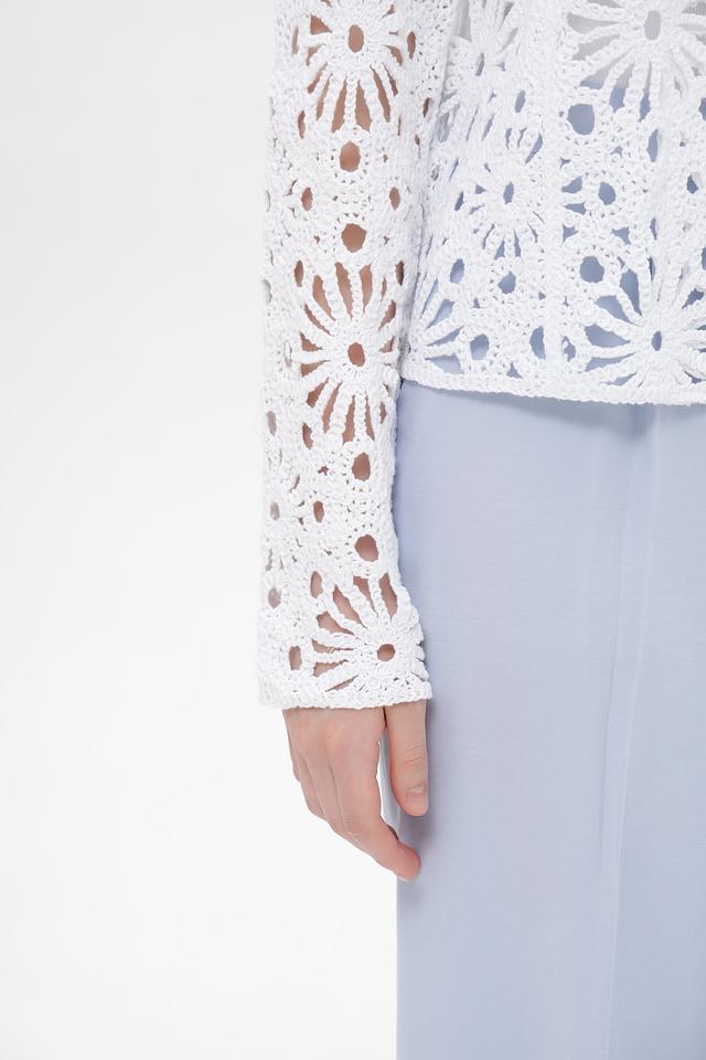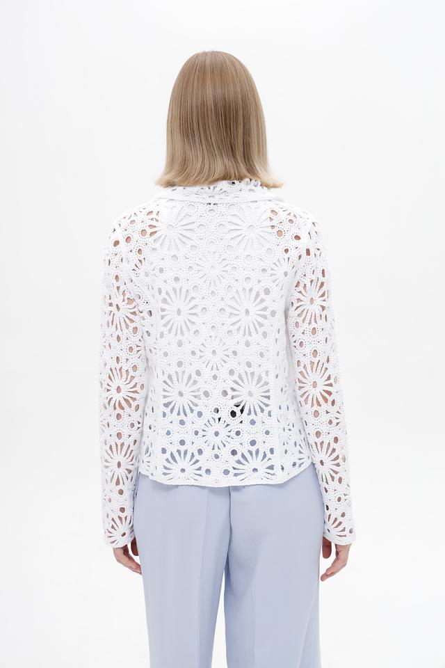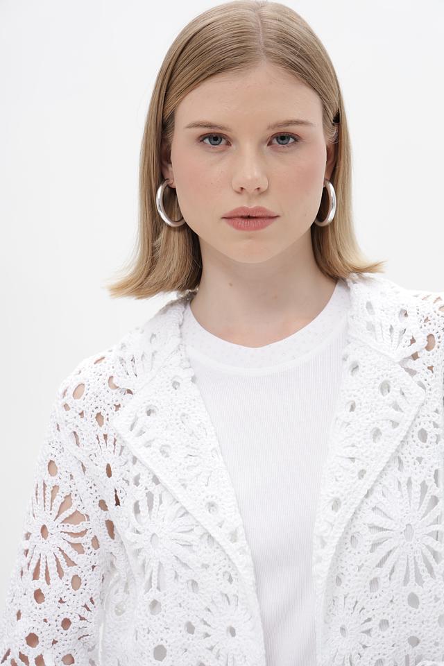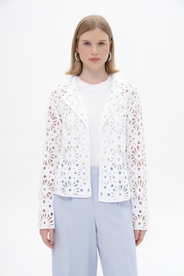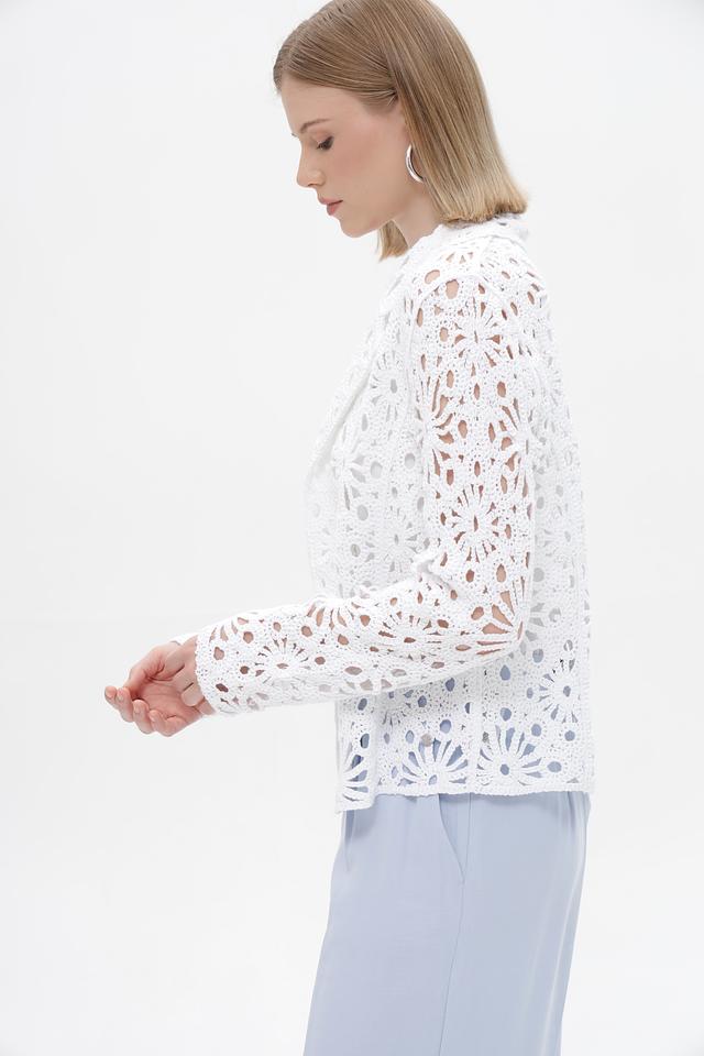 Ажурная отделка придает жакету легкость и изысканность, делая его идеальным выбором для особых случаев или повседневной носки. Жакет хорошо сочетается с юбками, брюками и платьями, позволяя создавать стильные и женственные ансамбли.