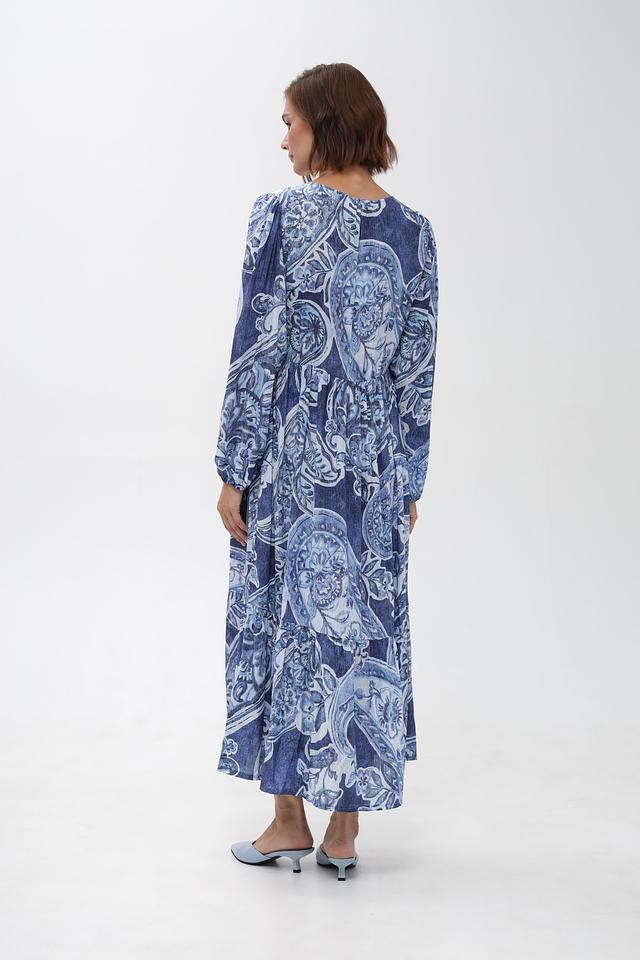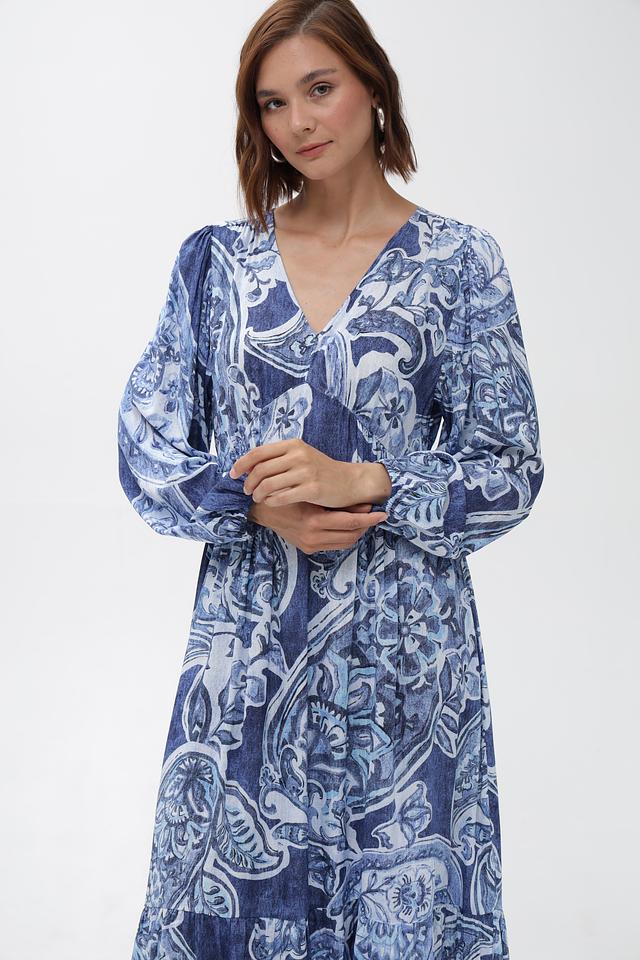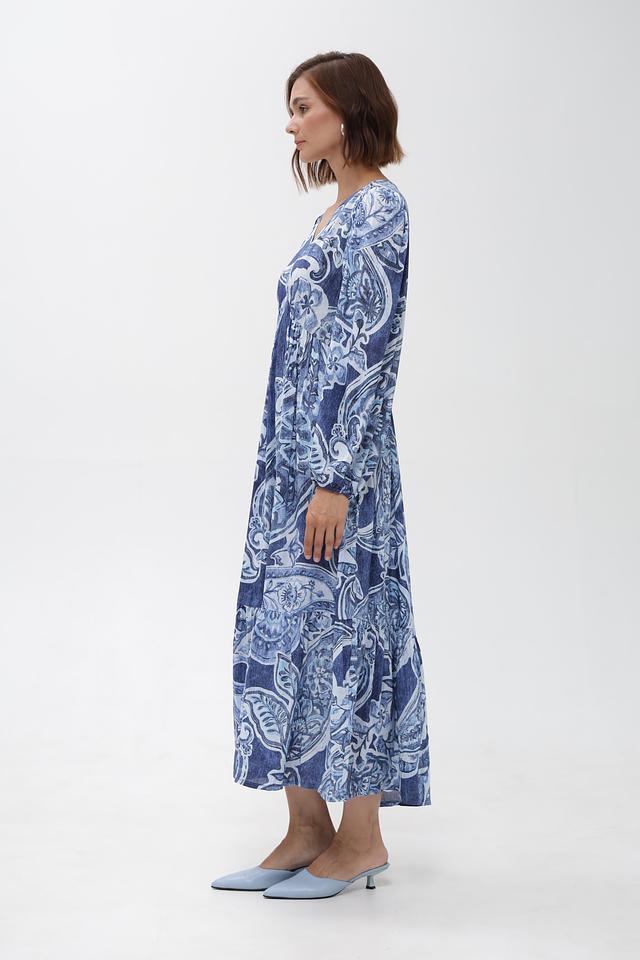 Платье имеет V-образный вырез и длинные рукава с небольшими присборами на манжетах. Свободный крой обеспечивает комфорт при носке, а многослойная юбка добавляет динамики и легкости образу.