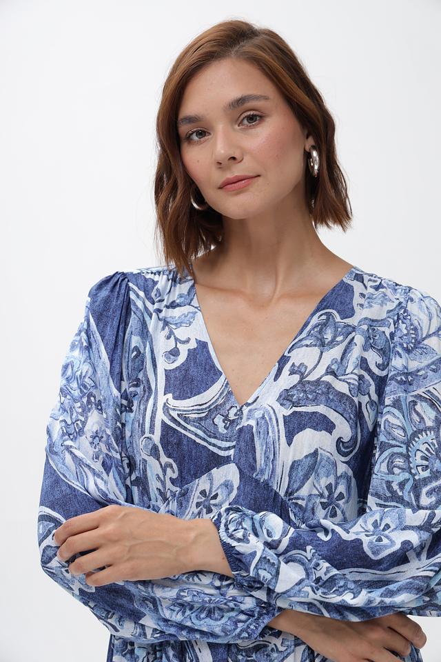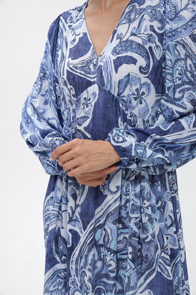 Изысканное платье от бренда Monari станет прекрасным дополнением вашего гардероба. Модель выполнена в синих тонах и украшена ярким цветочным принтом в стиле пейсли, придающим образу особую элегантность.