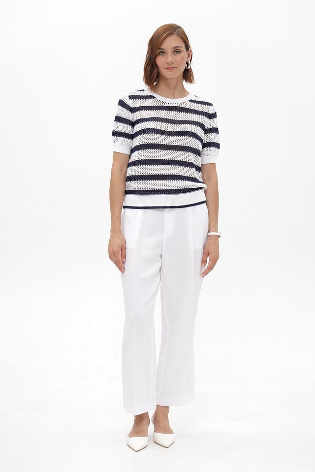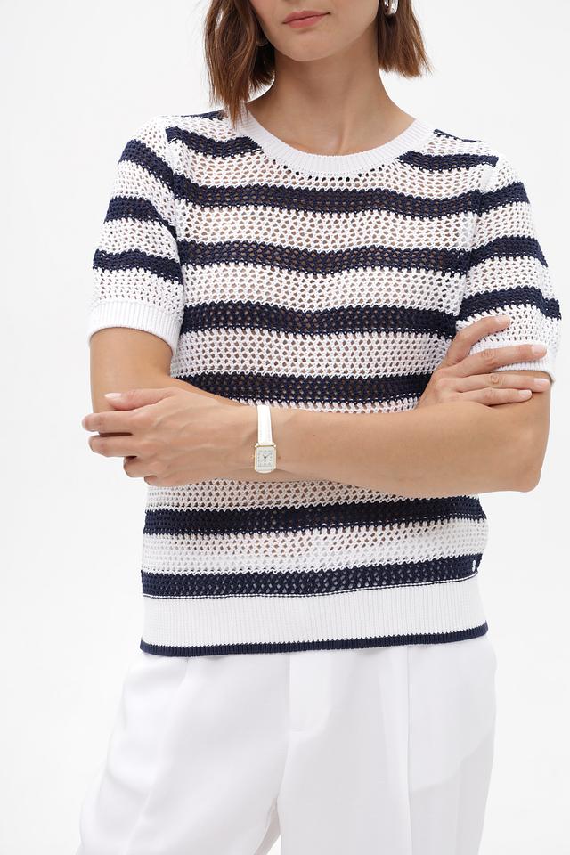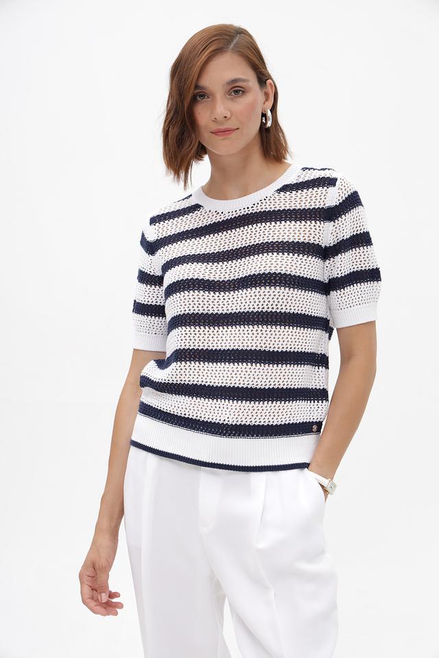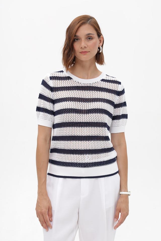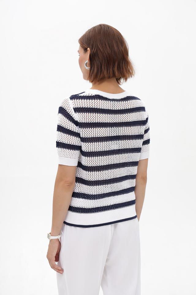 Женский пуловер Monari белого и синего цвета в горизонтальную полоску. Модель выполнена из 100% хлопка, с коротким рукавом и округлым вырезом горловины. Состав: хлопок 100%