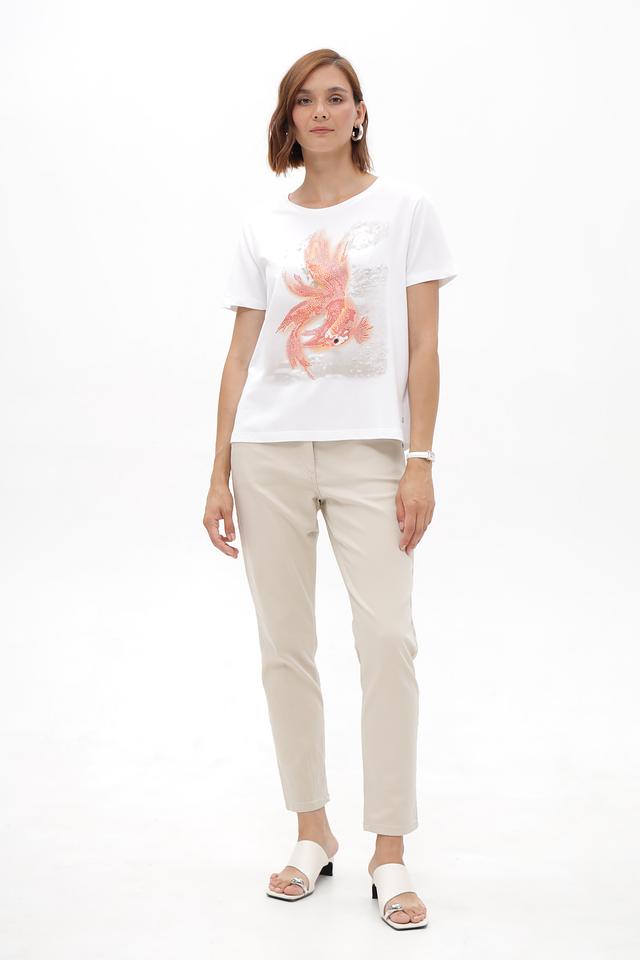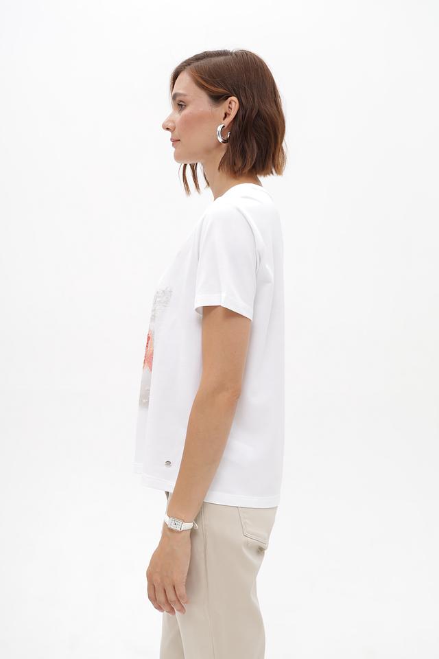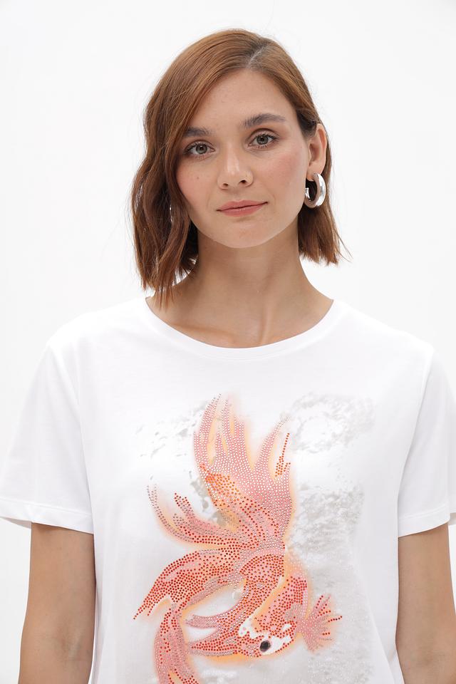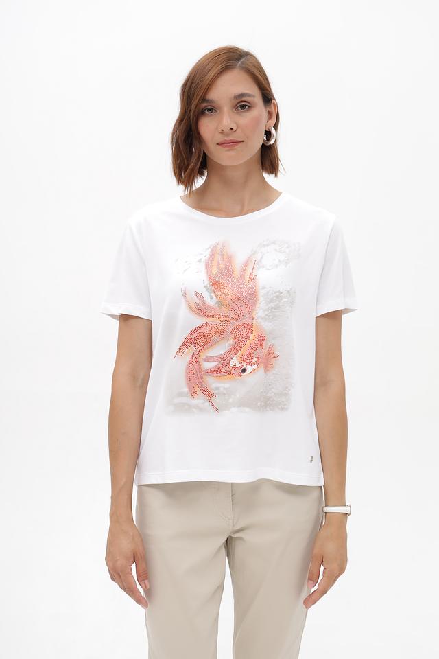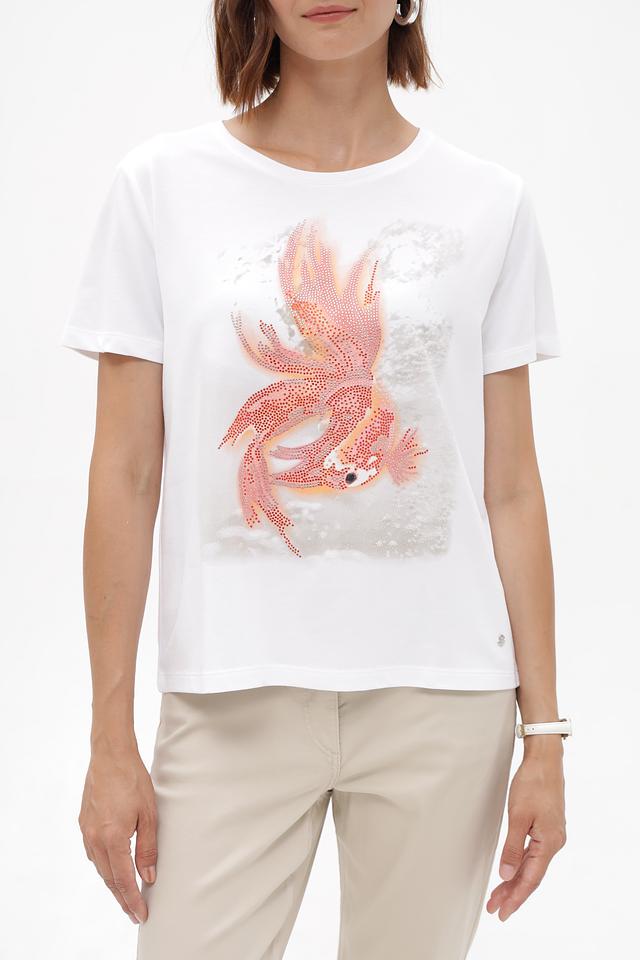 Белая футболка Monari с ярким принтом рыбы. Изготовлена из мягкого хлопка с модалом для комфорта и приятных ощущений. Идеальный выбор для создания стильного повседневного образа. Состав: хлопок 50%, модал 50%