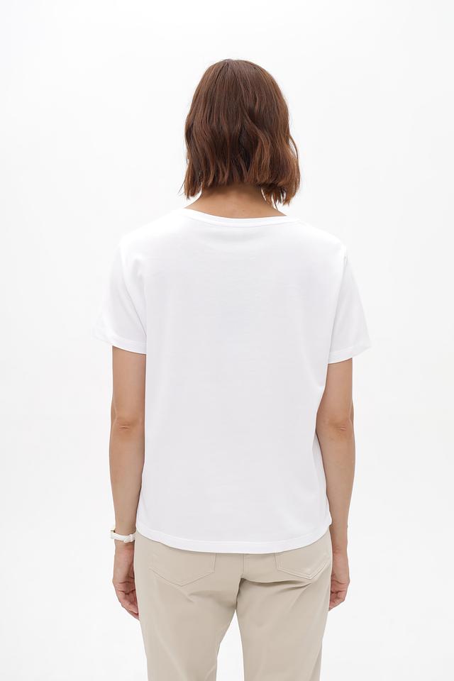 Футболка имеет классический прямой крой, круглый вырез горловины и короткие рукава. Она прекрасно сочетается с джинсами, брюками или юбками, позволяя создавать разнообразные образы для повседневной жизни.
