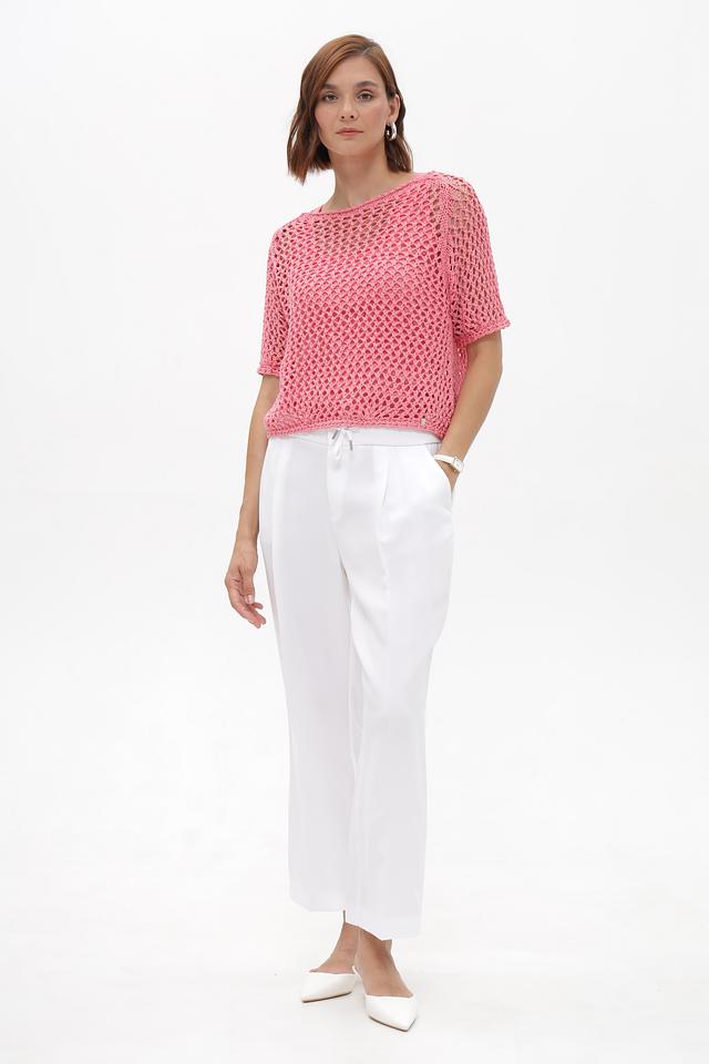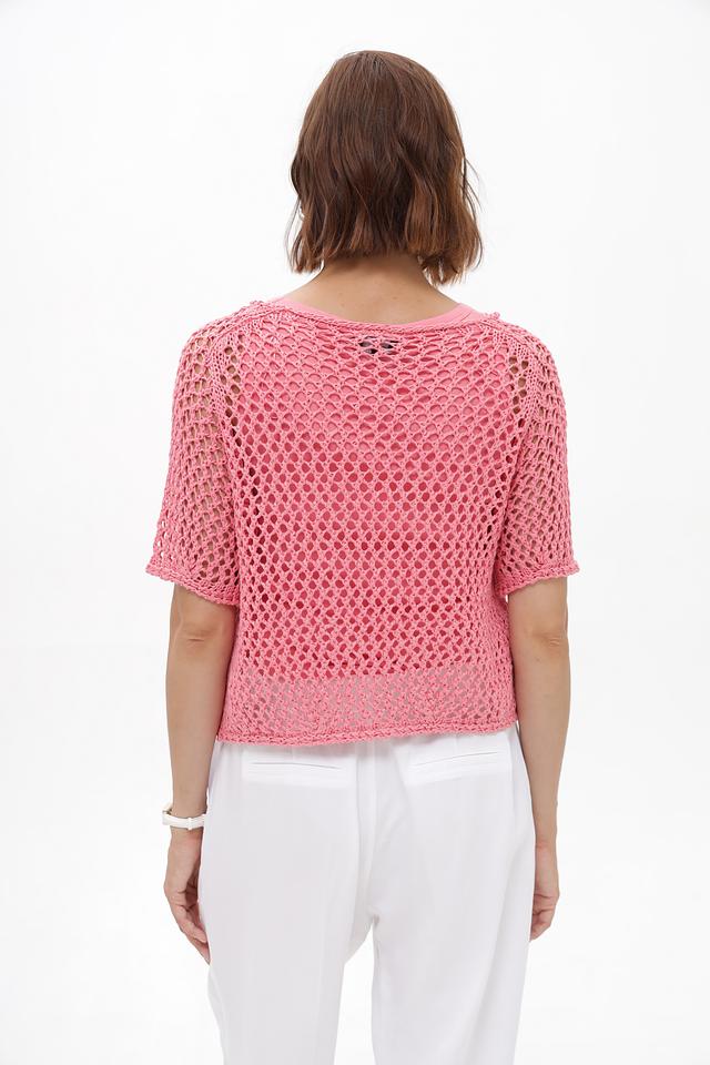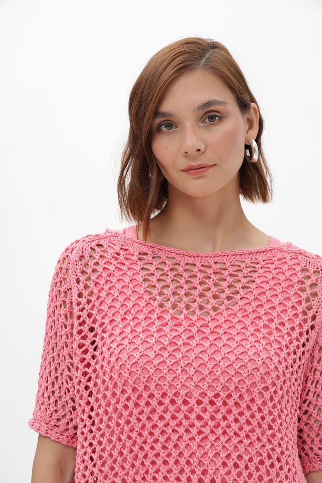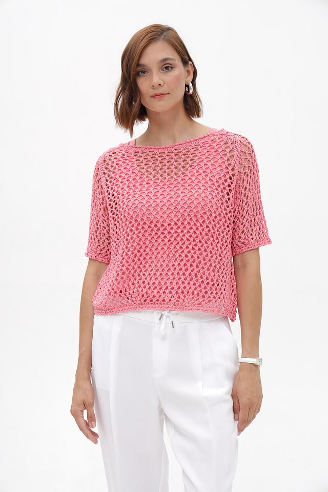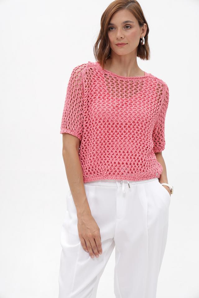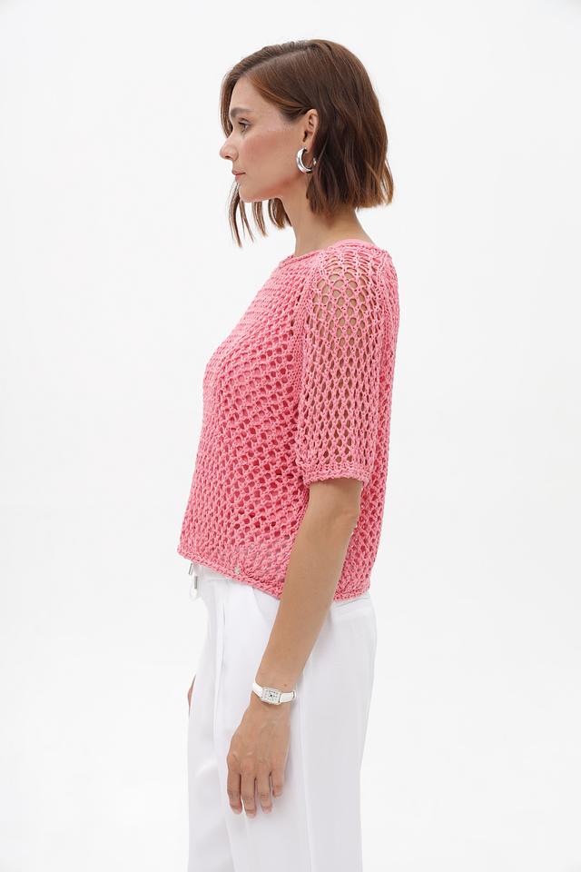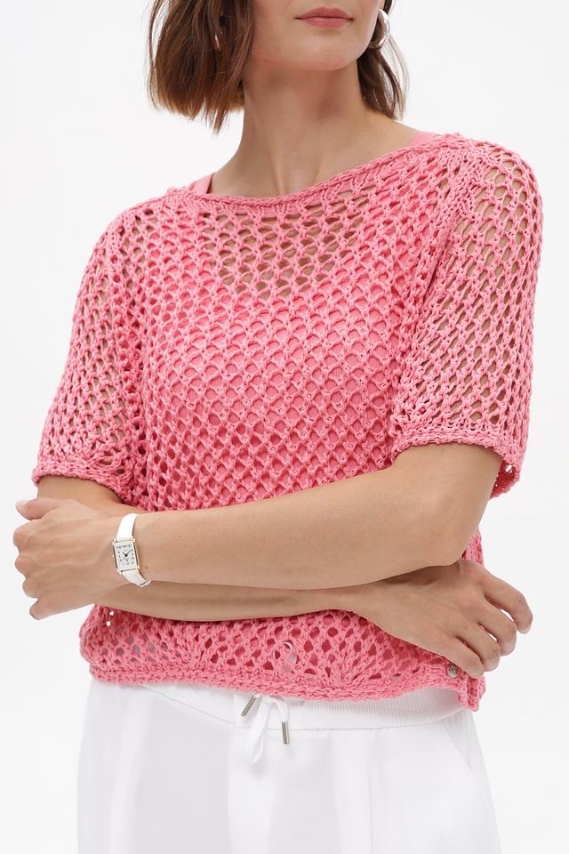 Розовый пуловер Monari из 100% полиакрила с ажурным плетением. Короткий крой и свободная посадка делают этот пуловер отличным выбором для создания летних образов. Состав: полиакрил 100%