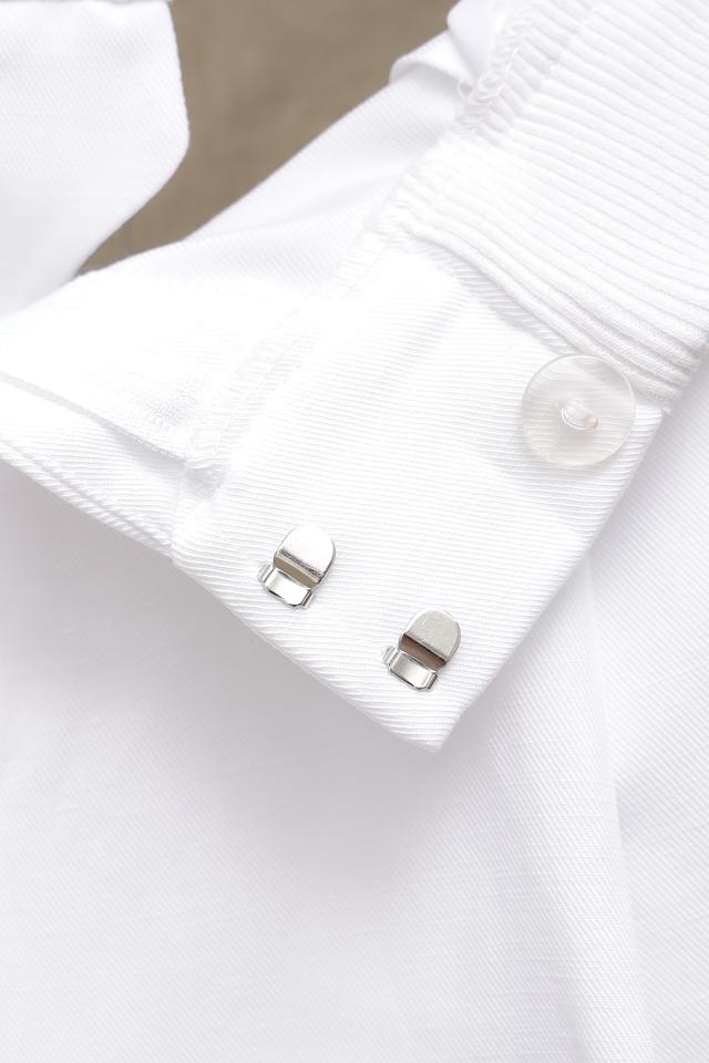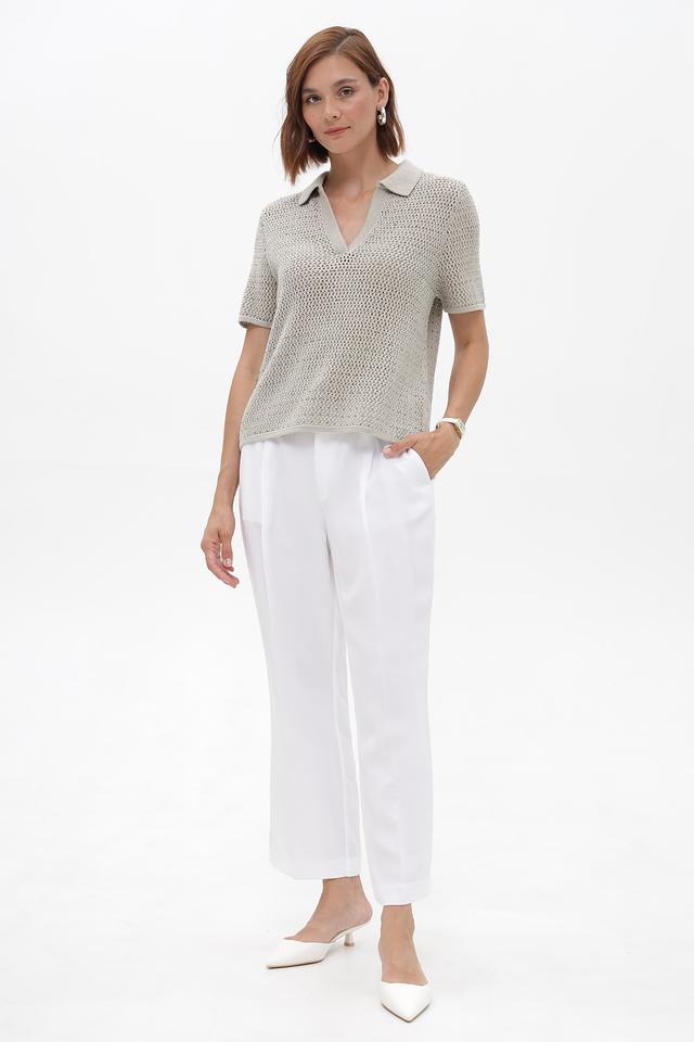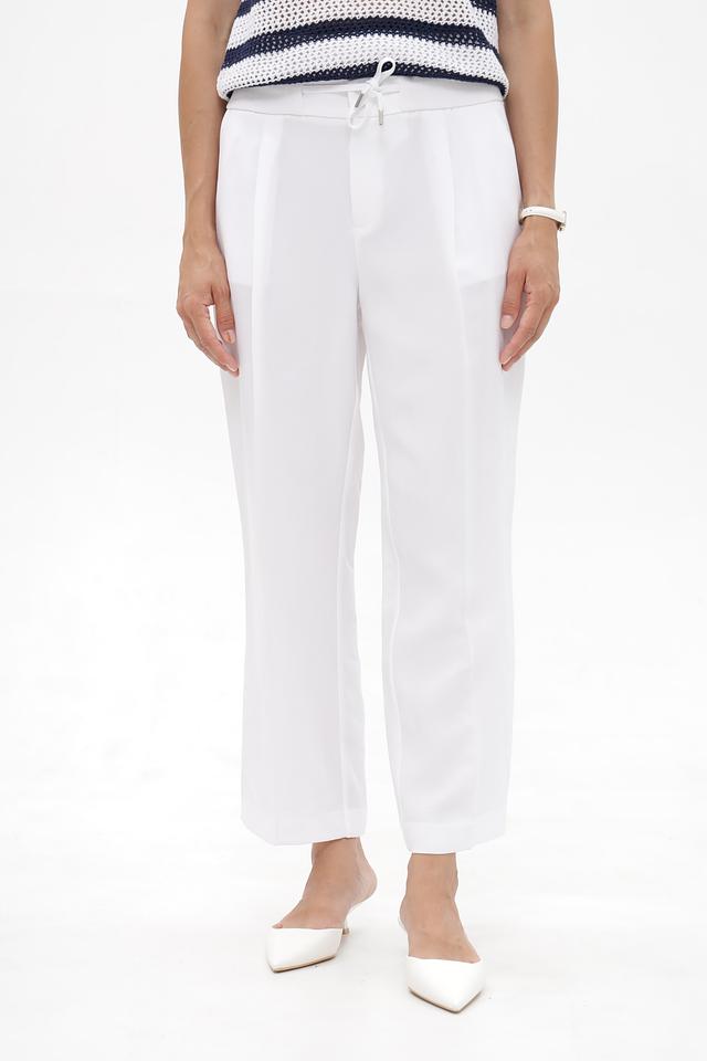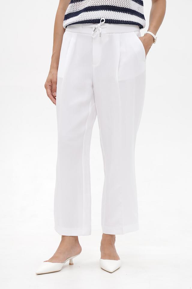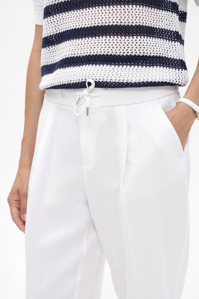 Брюки имеют классический белый цвет, прямой крой и пояс на эластичной резинке с завязками. На брюках есть боковые карманы. Особенности кроя подчеркивают фигуру, а удобная посадка позволяет чувствовать себя комфортно в течение всего дня.