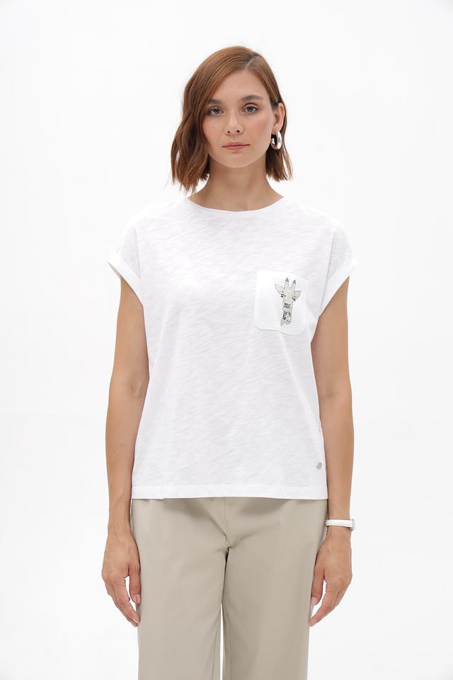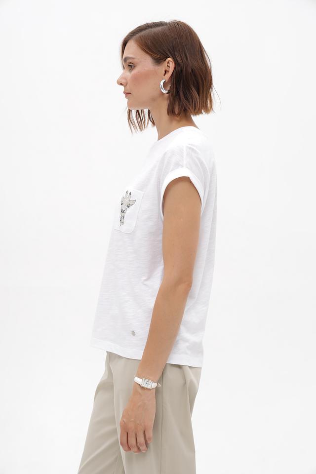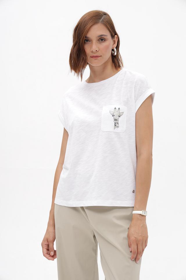 Белая футболка Monari с короткими рукавами и вышивкой в виде жирафа на нагрудном кармане. Изготовлена из мягкого хлопка с добавлением модала для комфорта. Идеальный выбор для создания повседневного образа. Состав: хлопок 50%, модал 50%