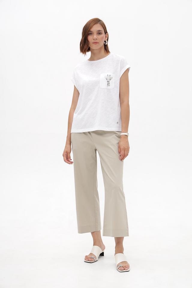 Основной акцент в дизайне – вышивка с изображением жирафа на нагрудном кармане. Вышивка выполнена в нейтральных тонах, что делает футболку универсальной и легко сочетаемой с другими элементами гардероба. Футболка отлично подойдет для создания повседневного, непринужденного стиля.