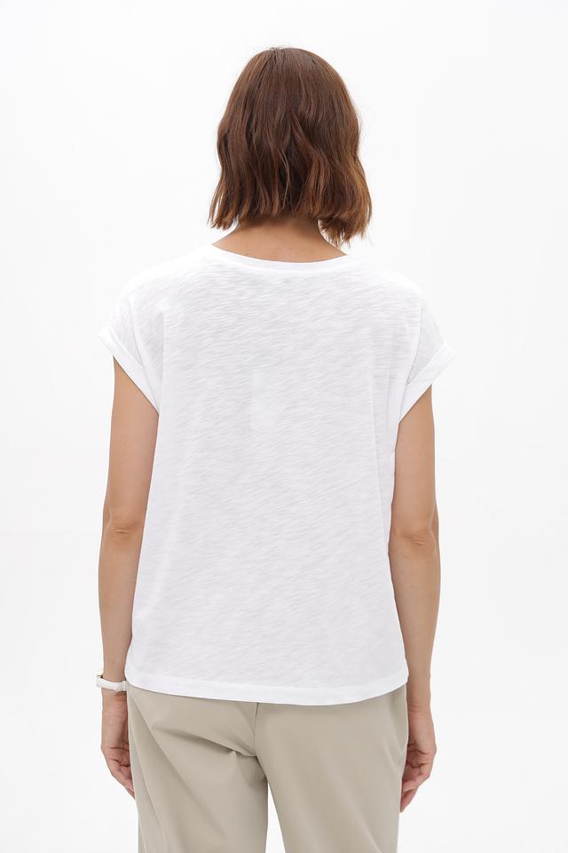 Модель имеет прямой, слегка свободный крой, который не стесняет движений и подходит для разных типов фигуры. Футболка дополнена короткими рукавами с манжетами, которые можно подвернуть, создавая различный образ.
