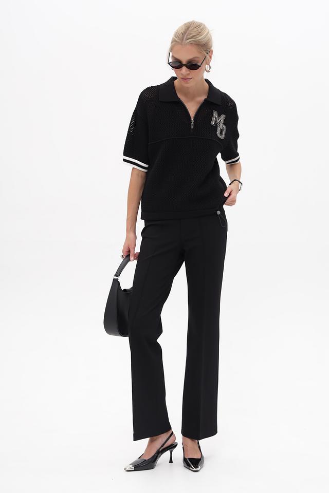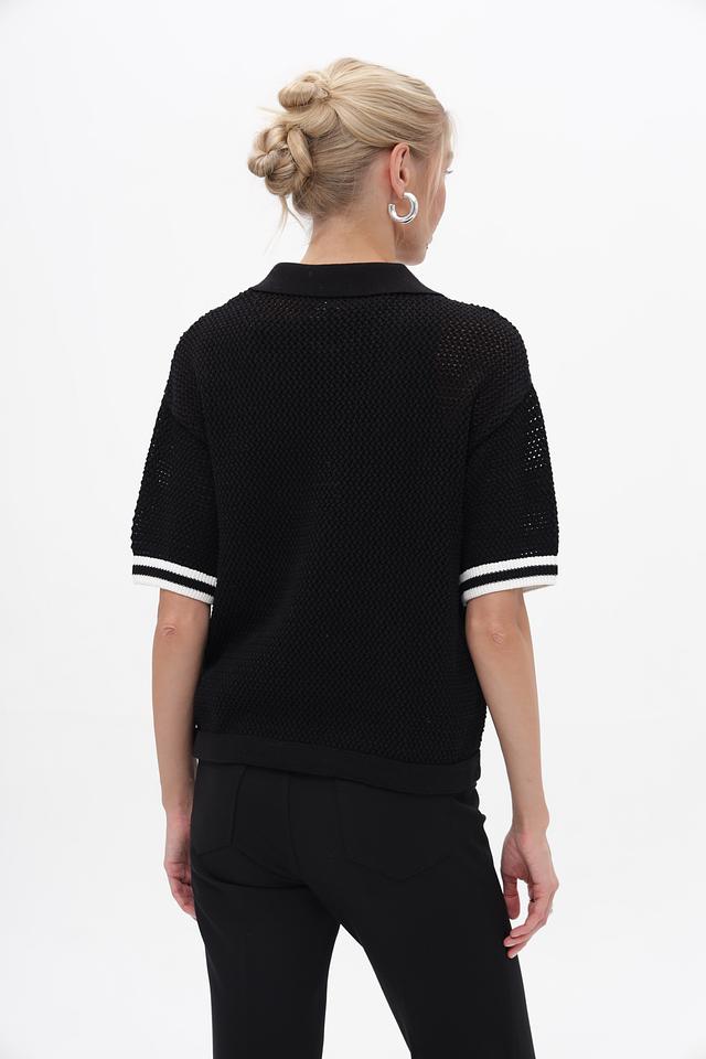 Пуловер имеет короткие рукава и классический воротник-поло, украшенный молнией. Чёрный цвет изделия делает его универсальным и легко сочетаемым с различными элементами одежды.