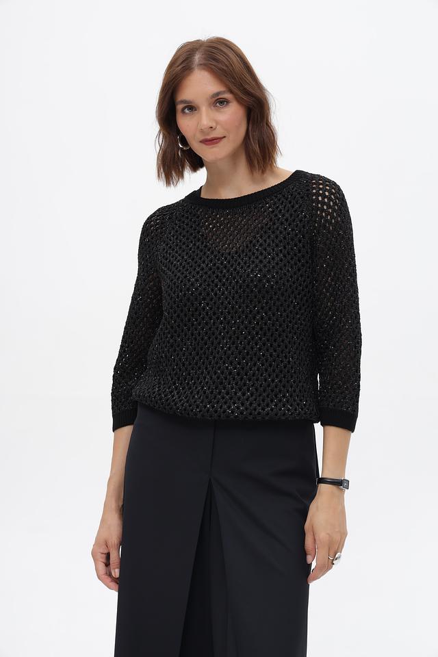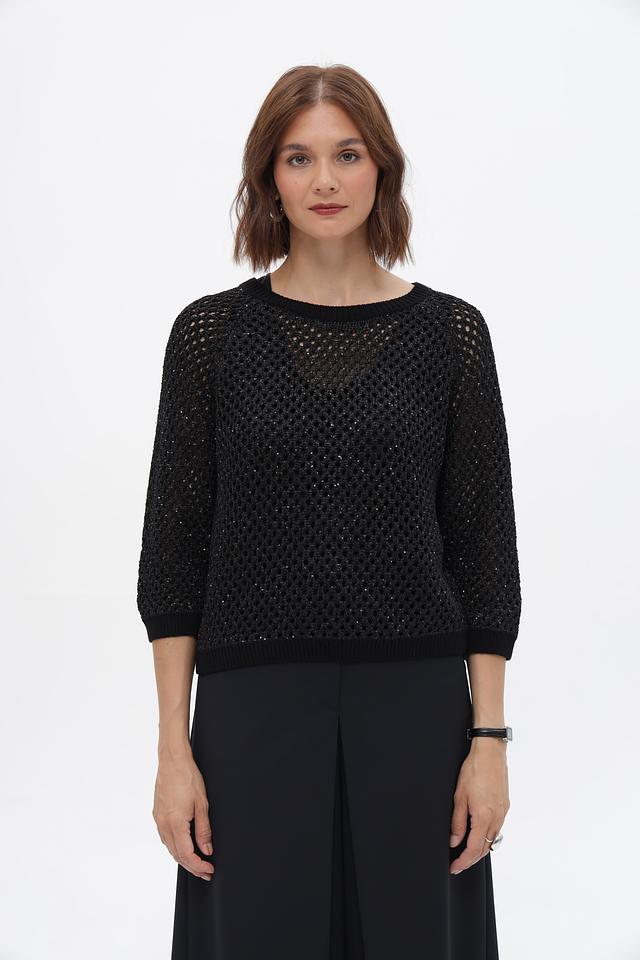 Чёрный пуловер от Monari с ажурной вязкой и рукавами 3/4. Модель выполнена из мягкого сочетания полиэстера и хлопка, обеспечивающего комфорт и удобство в носке. Состав: полиэстер 65%, хлопок 35%