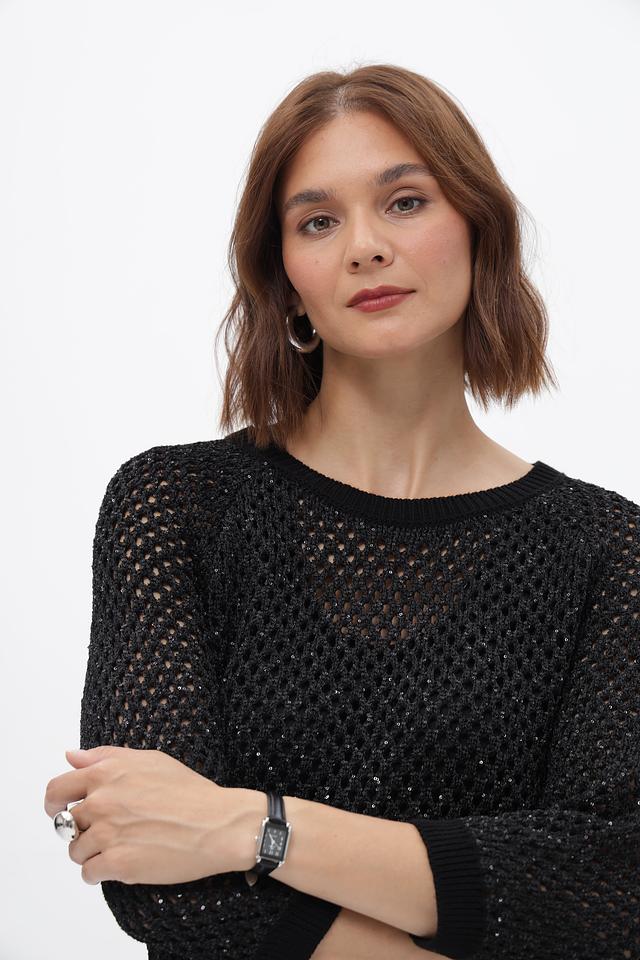 Пуловер имеет ажурную вязку, которая придает ему легкость и воздушность. Рукава длиной 3/4 делают его идеальным для теплой погоды или для создания многослойных образов. Круглый вырез горловины подчеркивает женственность силуэта.