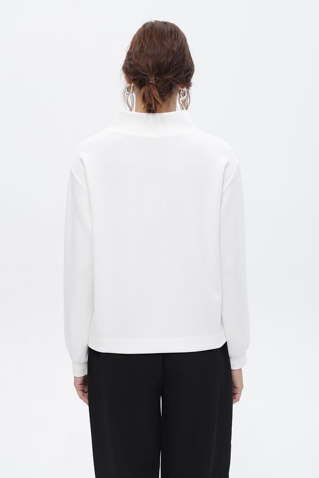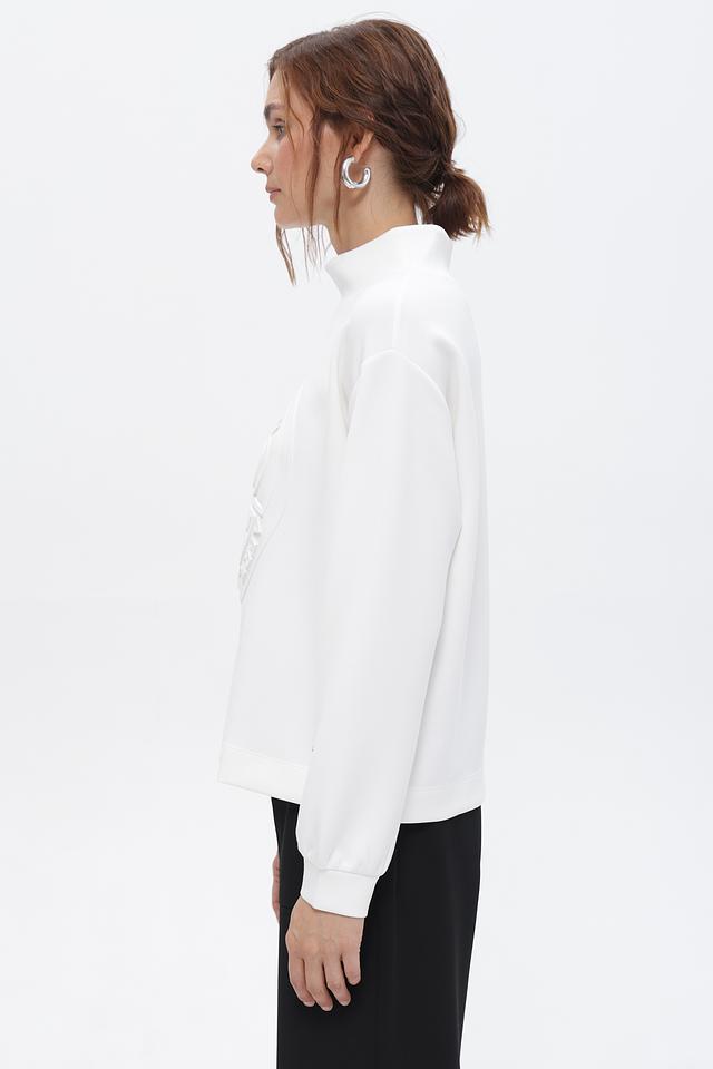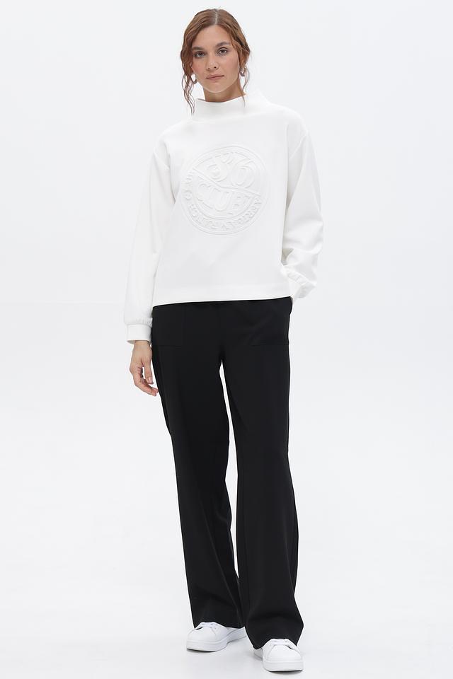 Пуловер имеет свободный крой, обеспечивающий комфорт в носке, и воротник-стойку, добавляющий изысканности. Главной особенностью модели является объёмный логотип, выполненный в тон ткани, придающий ей индивидуальность.