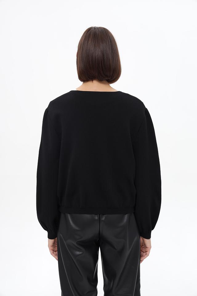 Жакет имеет приталенный силуэт и застегивается на молнию. Воротник-стойка добавляет образу элегантности. Рукава объёмные, фонарики, с манжетами на резинке, что создаёт стильный и современный вид.