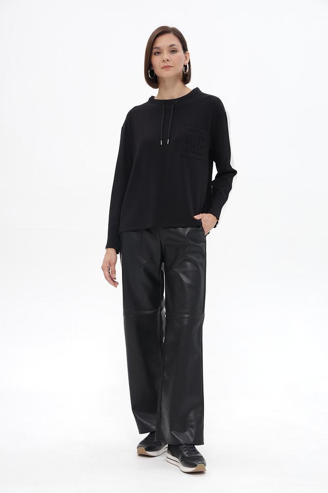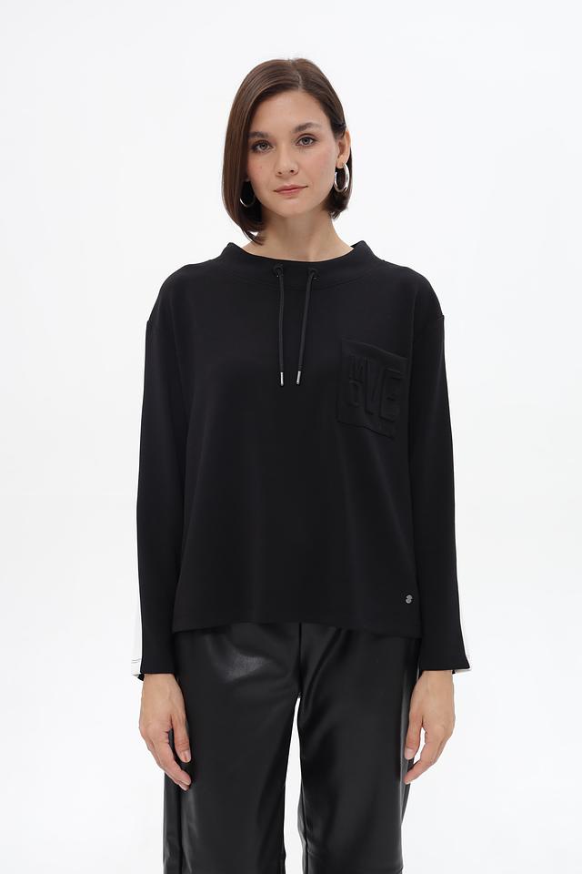 Чёрный пуловер от Monari с декоративной полосой на рукаве. Изготовлен из мягкого модала с добавлением полиэстера и эластана, обеспечивающих комфорт и отличную посадку. Состав: модал 52%, полиэстер 42%, эластан 6%