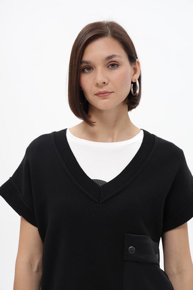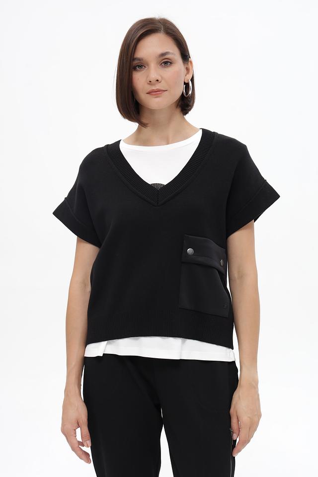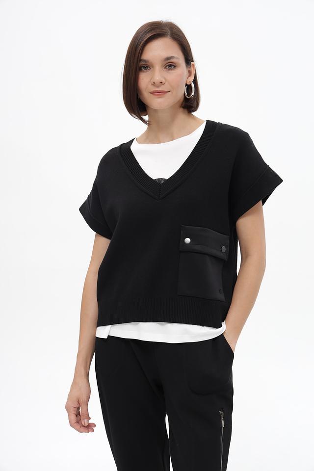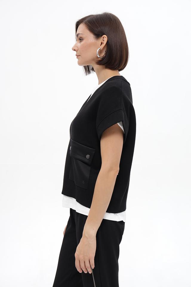 Модель имеет V-образный вырез и короткие рукава, что делает её подходящей для создания многослойных образов. Отличительной деталью является накладной карман на передней панели, который добавляет жилету функциональности и акцента.