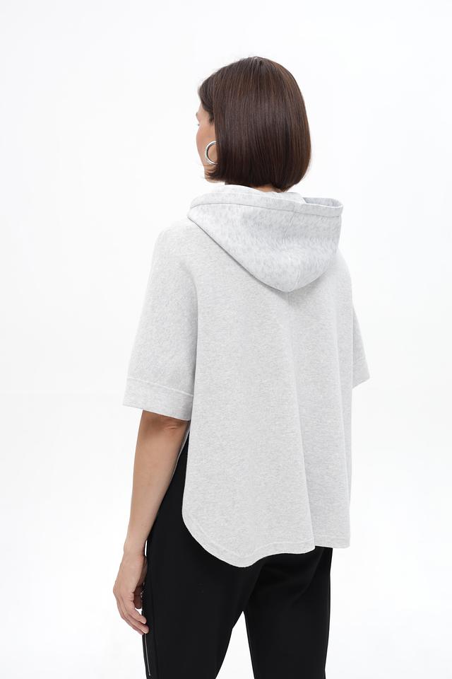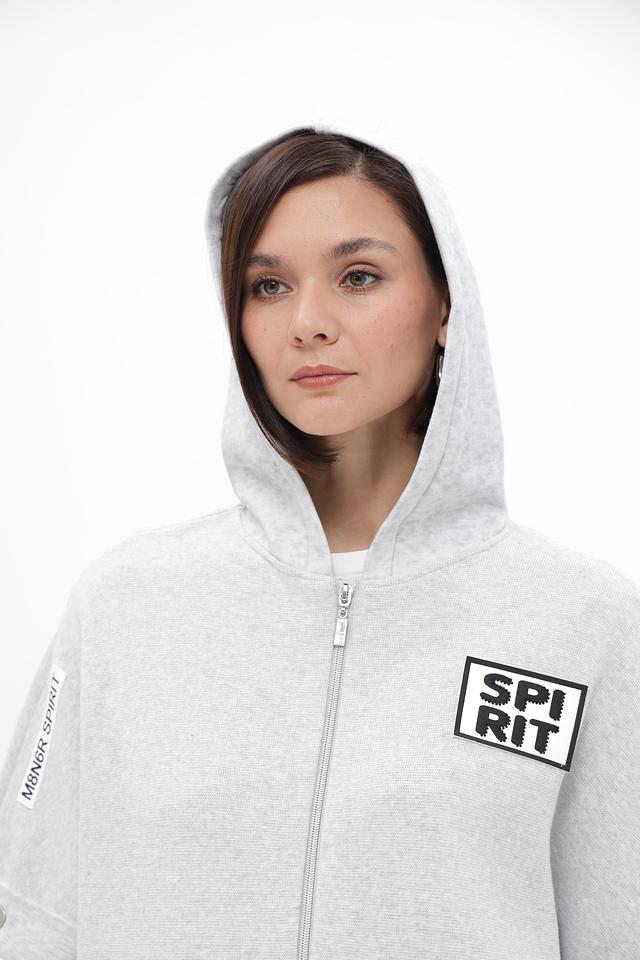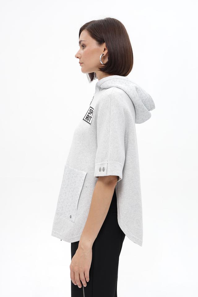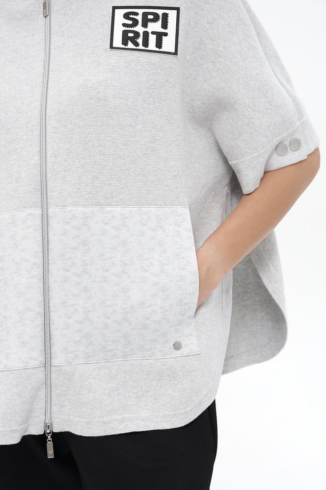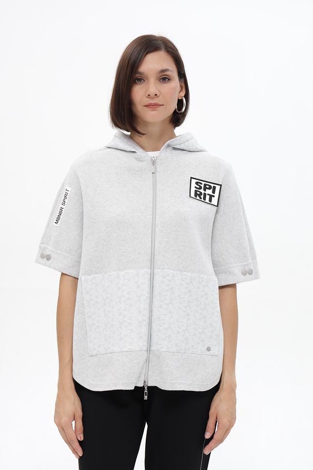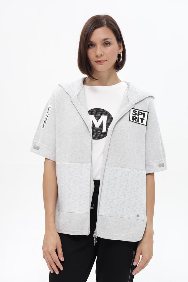 Серый жакет Monari с коротким рукавом и капюшоном станет стильным дополнением к вашему гардеробу. Модель выполнена из мягкого хлопка и украшена ярким принтом. Идеальный выбор для создания комфортного и модного образа. Состав: хлопок 100%