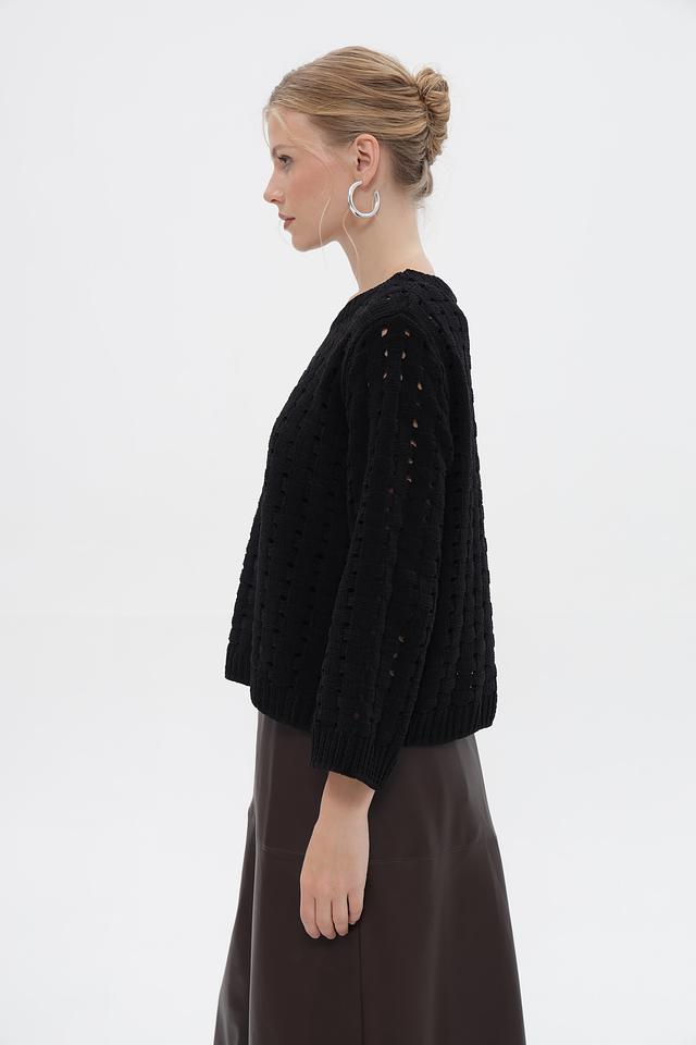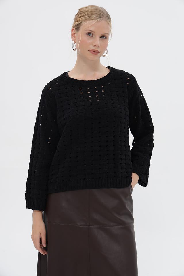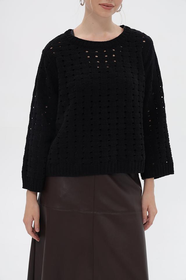 Чёрный пуловер Monari с оригинальной ажурной вязкой. Изготовлен из 100% полиэстера, обеспечивающего комфорт и лёгкость в уходе. Идеально дополнит ваш повседневный образ. Состав: полиэстер 100%