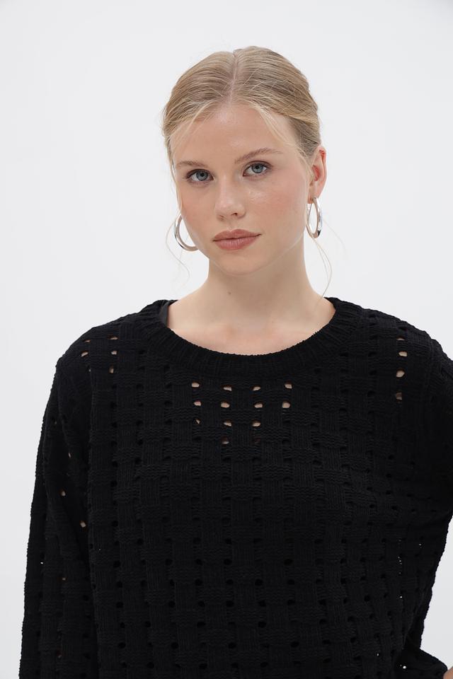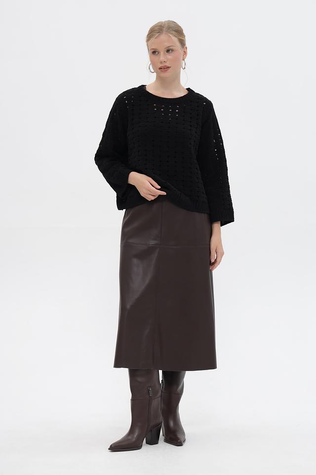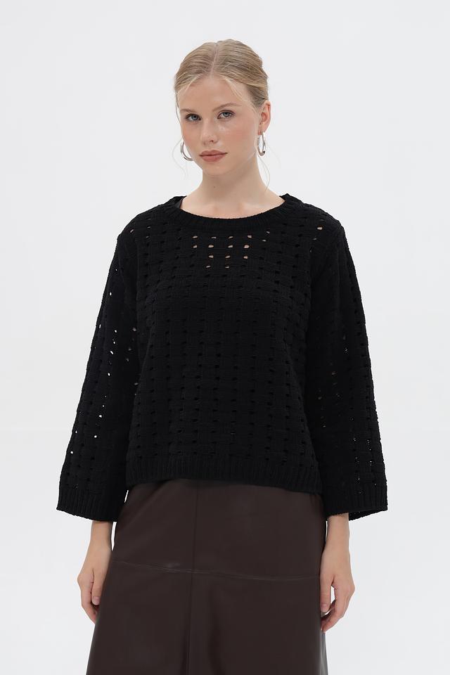 Пуловер отличается оригинальным дизайном благодаря ажурной вязке, которая добавляет изделию изысканности. Круглый вырез горловины и укороченные рукава делают его универсальным для создания различных образов.