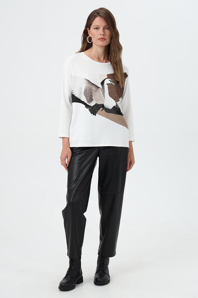 Белый лонгслив Monari с эффектным принтом лебедя станет ярким акцентом вашего образа. Модель выполнена из приятной к телу ткани, рукав 3/4. Состав: вискоза 95%, эластан 5%