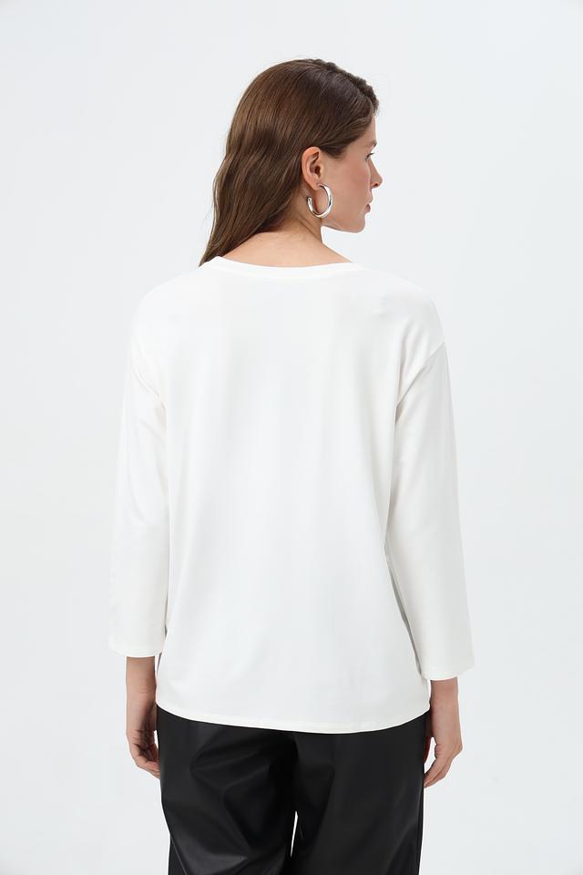 Лонгслив имеет удобный круглый вырез и рукав длиной 3/4. Свободный крой обеспечивает комфортную посадку по фигуре.
