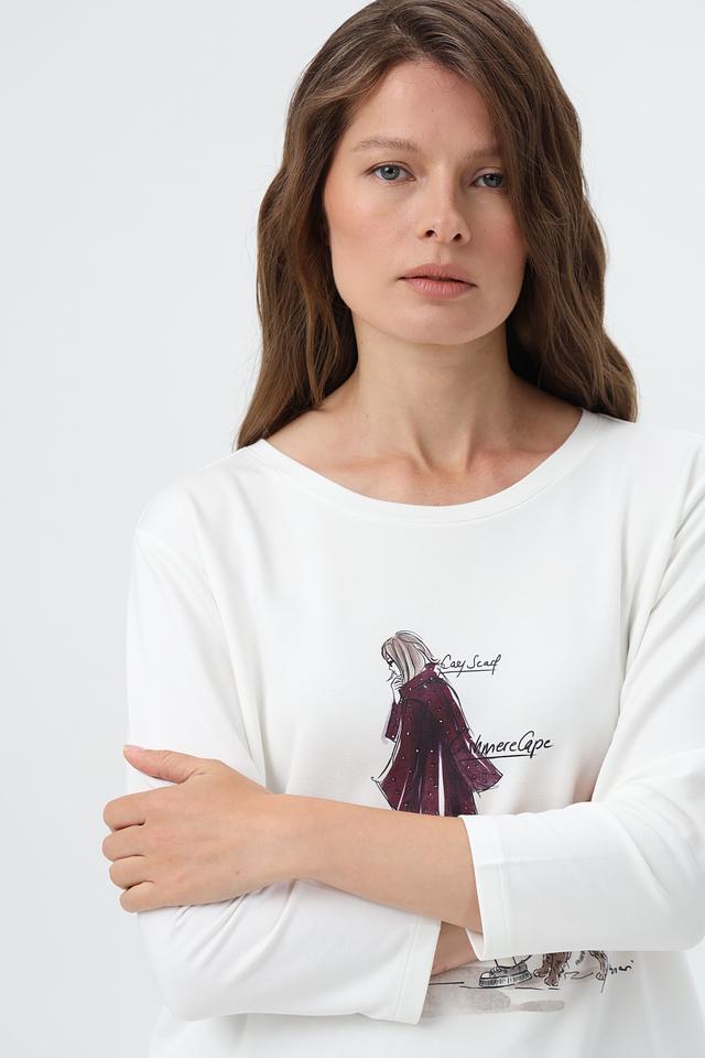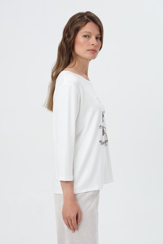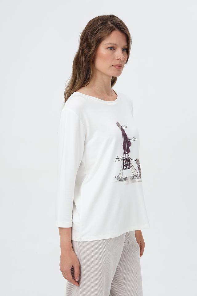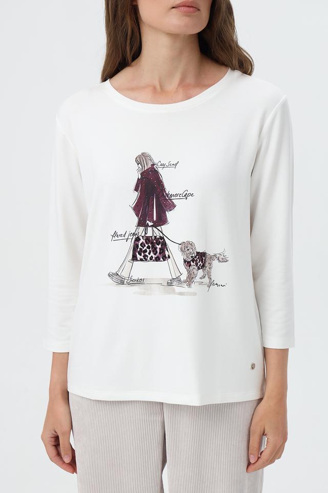 Элегантный лонгслив от бренда Monari станет отличным дополнением к вашему образу. Выполнен в белом цвете и украшен стильным принтом с изображением девушки, выгуливающей собаку.