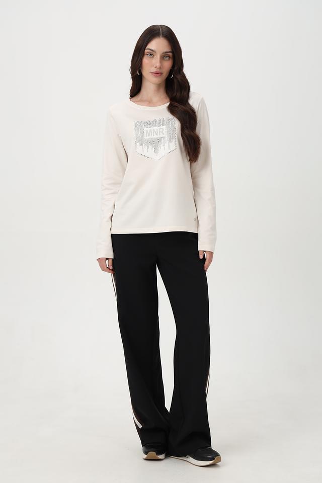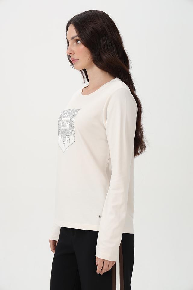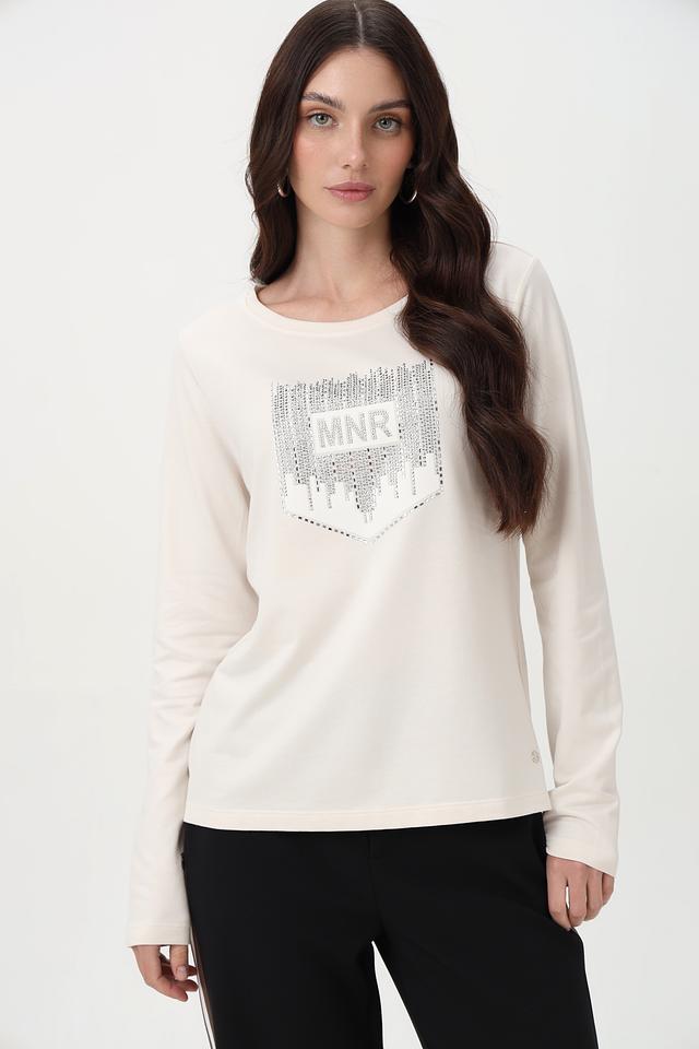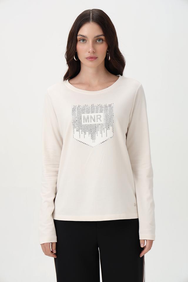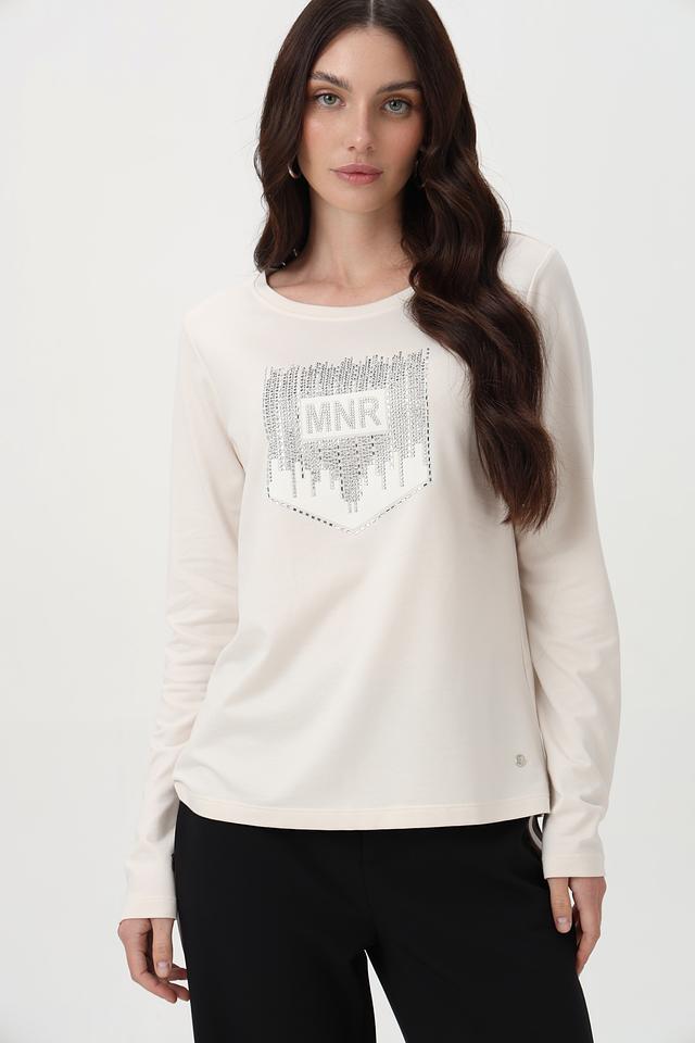 Элегантный лонгслив от бренда Monari станет отличным дополнением к вашему образу. Модель выполнена в нежном бежевом цвете и украшена эффектным принтом с логотипом, выполненным с использованием страз.